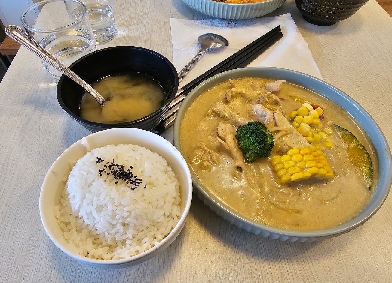 老闆娘非常親切,會事先告知餐點晚點上,綠咖哩還不錯吃,可惜的是醬汁稍微的不夠,不然就完美了,月亮蝦餅還不錯,丼飯略顯普通,味噌湯還不錯喝,湯裡滿滿的海帶,且還可以無限續碗。