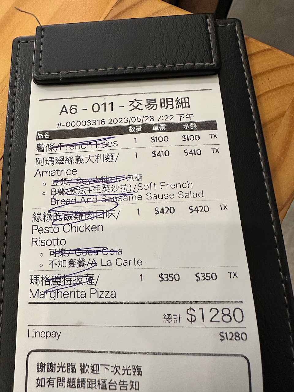 燉飯少加帕瑪森起司少一味。但招牌鹹豬肉奶油義大利麵很好吃。現場油煙味稍微。廁所佈置很貼心乾淨,服務人員態度佳!?