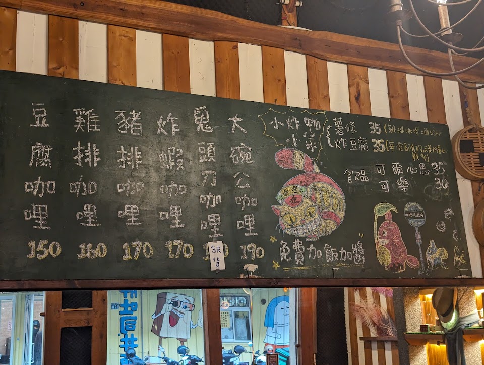餐廳在巷子裡,門口有一些機車位可以停,朋友介紹這家店可以免費續飯續醬吃到飽,開店前朋友就先去等開門,已經有好幾組客人在等待了!一開門店內座位馬上就被一組一組的客人坐滿,不過可惜就是店內座位太少了,後面的客人只能在外面等候,很幸運的我們是第一批有位子的客人,點了雞排咖哩飯,味道還不錯,如圖所示可以看見有薯條、豆腐以及花椰菜?,我留了一些料在續飯時可以搭配著吃,原本想說續個一次就好,沒想到續了兩次,CP值蠻高的,吃得很飽,會跟身邊的朋友推薦,學生族大推!