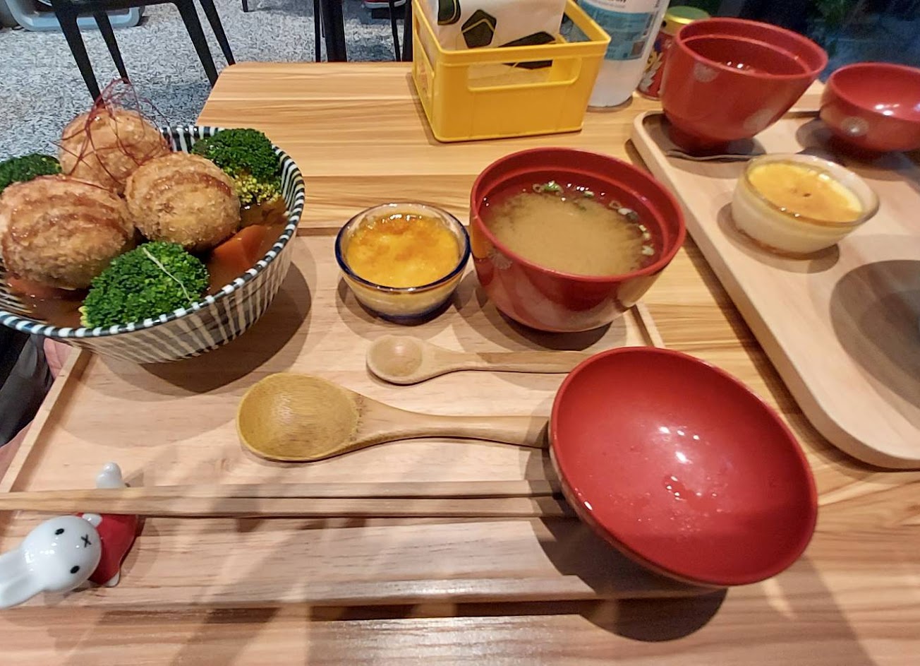 只有三種餐點,這次點了炸雞咖喱飯跟起司牛丸咖喱飯,都有附味噌湯跟烤布蕾