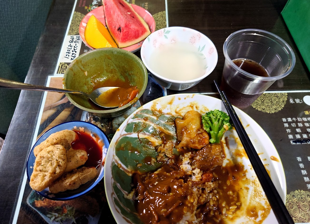 老闆非常好客!只點了一份咖喱卻送上了紅茶、熱湯、雞塊、水果,如果吃不飽的話還可以加飯,但應該不會有這個問題,結完帳後老闆還給了我荔枝跟香蕉,雖然是去吃咖喱,但當下像到了水果行,非常開心的一餐!