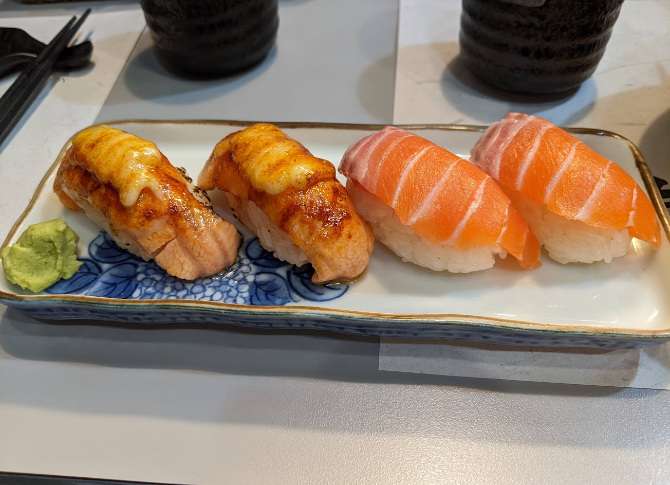 牛五花干貝丼飯味道比較普通,牛五花肉質普通,丼飯的話完全不太行,但考量到成本應該都被店租吃掉,也不好意思給予五星以下,炙燒比目魚握壽司對得起價格,也很好吃,入口即化,上面也有鮭魚卵做搭配,很值得點,建議可以朝單點握壽司方向點餐