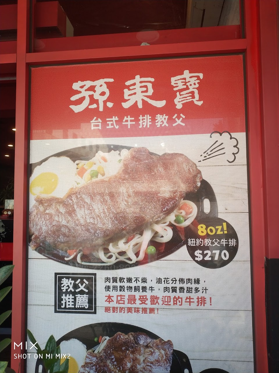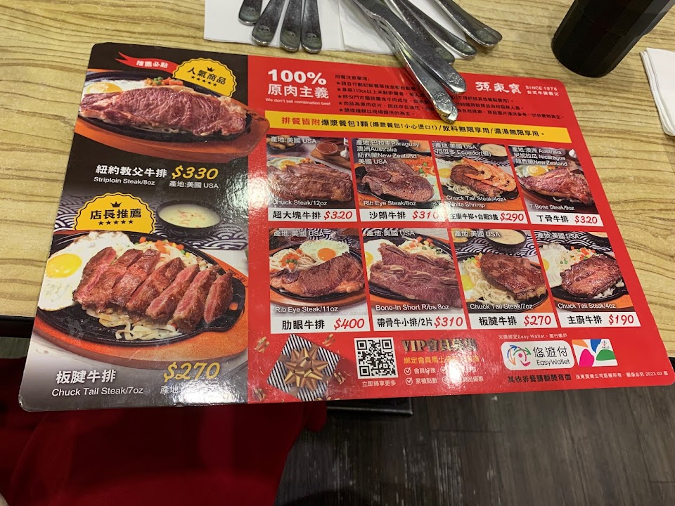 平價牛排店,口味比我O/貴O好很多,但環境較差,尤其油煙味很重,吃完到戶外散步半小時油煙味還在衣服上。另外,上菜較久,昨天2025點餐,等到2100牛排才上,有點久。