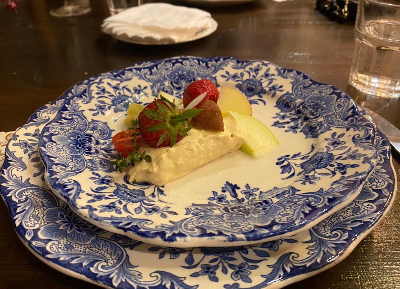 ✍️沙拉:春季菜單為西式醃菜沙拉,以優格製成的沙拉醬,搭配上有醃至過的紅白蘿蔔、玉米筍,不知道是否是醃製時間不夠長,蔬菜鹹度還是偏高,但搭配上其他水果有稍微中和鹹味,水果滿用心選用、蘋果香氣十足