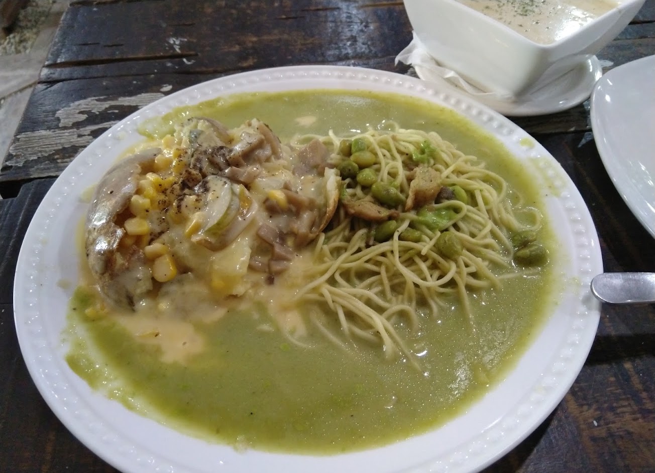蘑菇青醬麵,麵__是油麵,醬還好!+馬鈴薯烤熟淋醬;