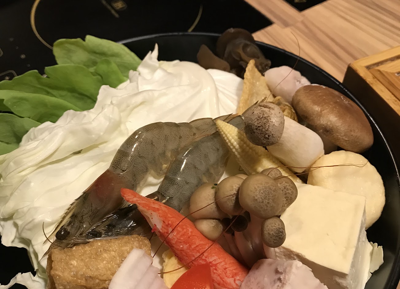 這次我點的是綜合海鮮鍋搭配鮮菇奶香鍋,附餐選擇比較容易吸取湯汁精華的冬粉,菜盤無論什麼鍋什麼湯底都一樣,綜合海鮮鍋有四尾蝦子,至於什麼蝦子我就不太清楚了…由大到小這樣XD~還有一碗鮮蚵.三種魚的魚片各兩片.透抽(還是小卷之類)一尾.生蠔一顆,全部都需要煮熟才能吃喔!這樣一份套餐就飽到不要不要了,記得其他單點不要點太多喔XP