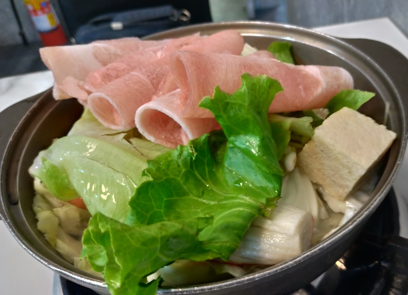 鍋物有鳥蛋、燕餃、魚板、凍豆腐、小魚豆腐、小丸子、高麗菜、青江菜一根、豆皮、海帶一條、蟹肉棒、金針菇