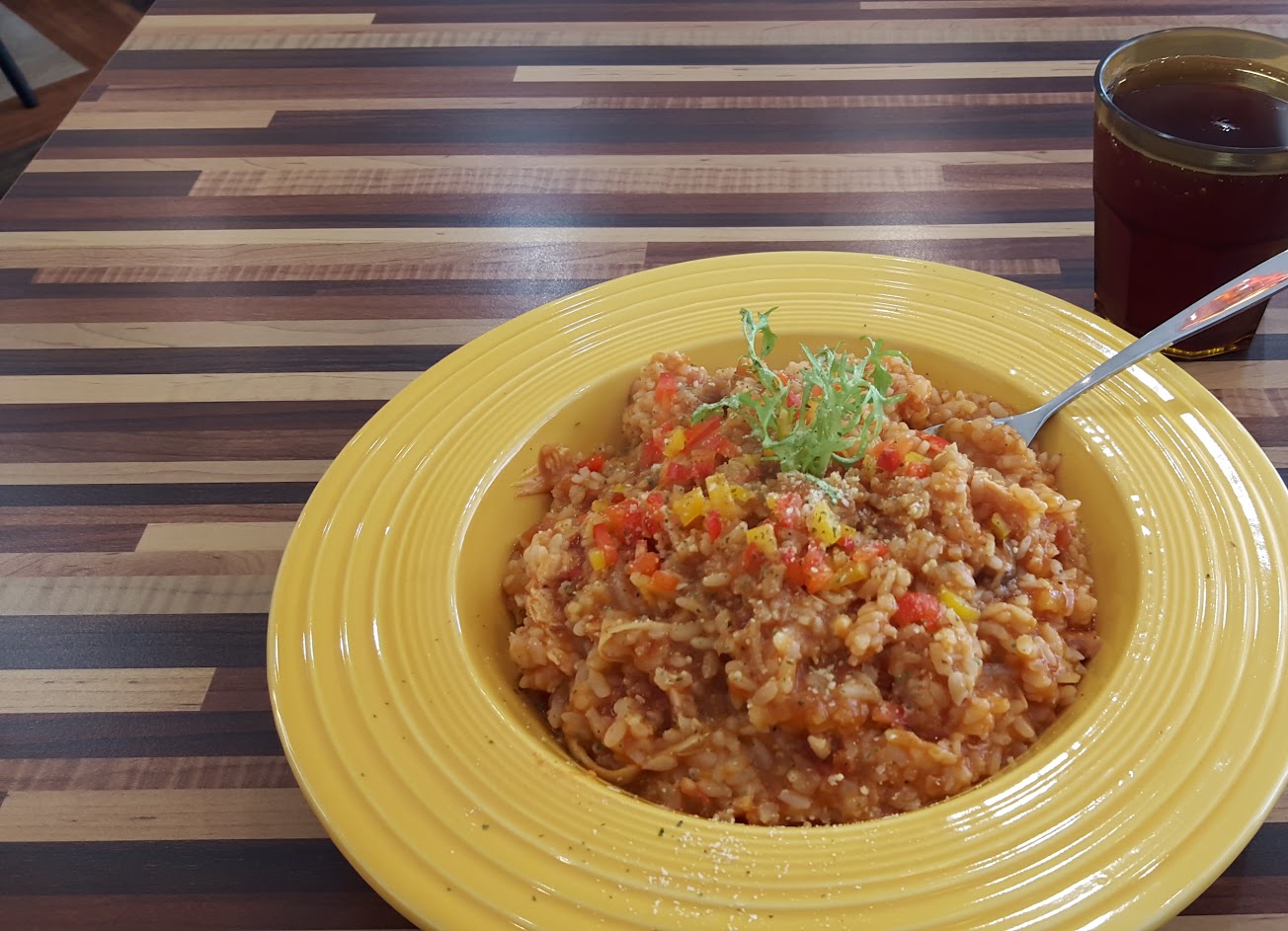 青醬雞肉燉飯味道濃郁,還能免費加量,配餐麵包也好吃。