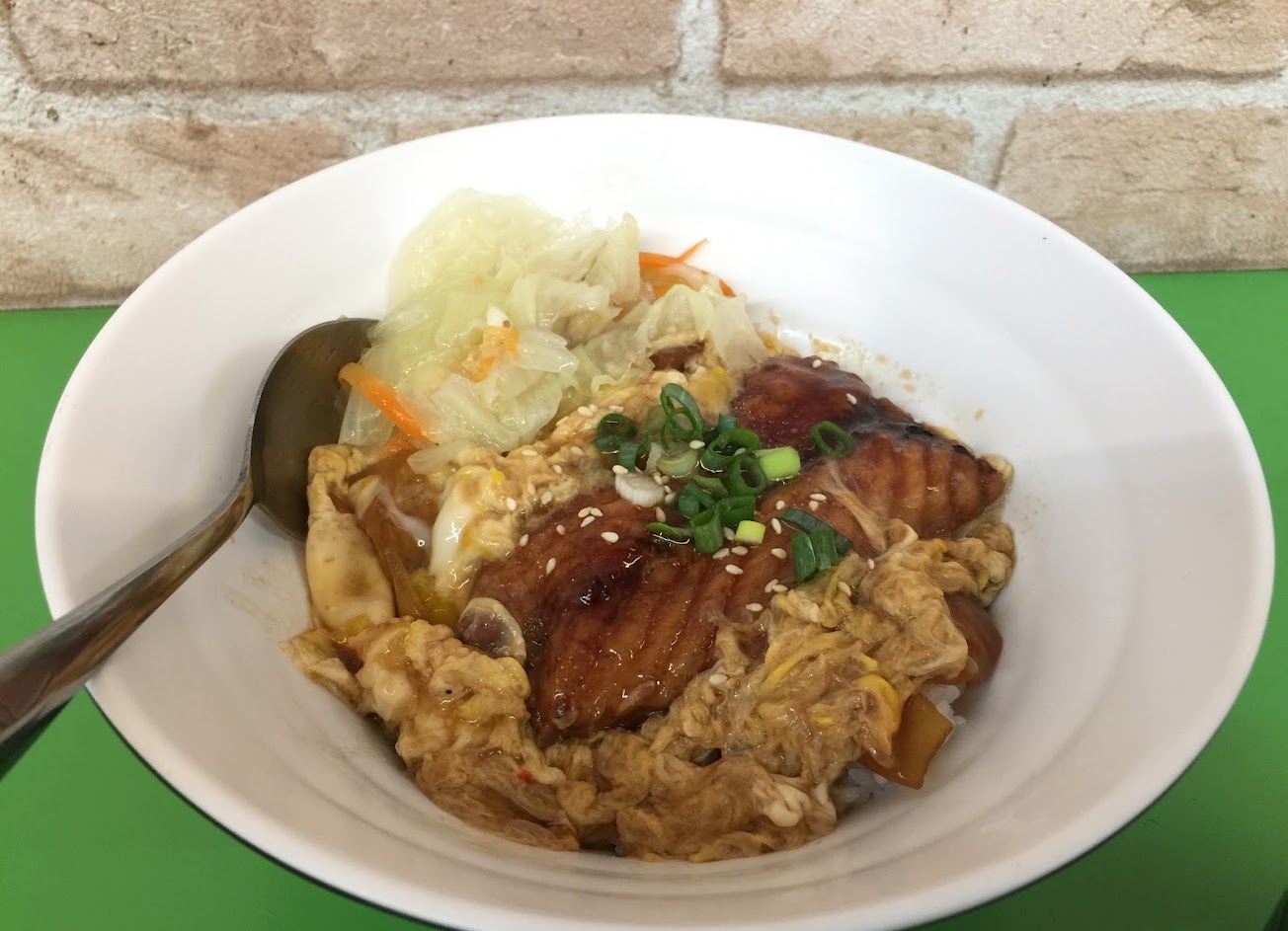 點了劃星推薦的醬燒豬排丼飯,裡頭加的不是洋蔥,而是空心菜。應該白飯飯量夠,加上飲料熱湯可以續,一碗可以賣到80,價位在學區附近稍高。