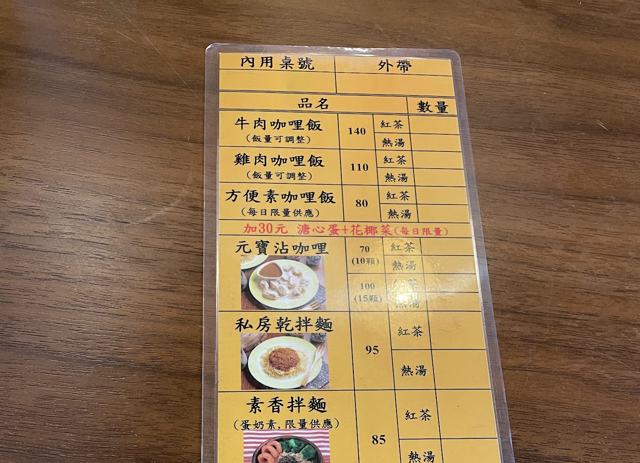 有乾拌麵、咖哩飯、咖哩水餃、炸物