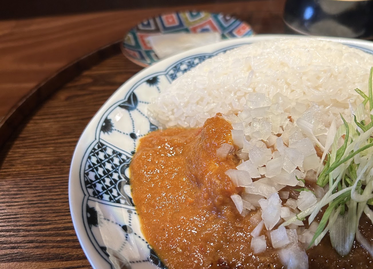 咖哩是少見的香料咖哩,辛香料味道很明顯,也可以在咖哩醬裡面吃到熬煮的洋蔥, 原本有搭配生洋蔥碎和蒜苗,可依個人需求跟店員說不要加;咖哩上會有一小匙辣油,對平常不吃辣的我來說大約是小辣(沒有特別拌開),但辣油增加了咖哩的香氣,吃起來也比較不膩口。 當天還有點炸牛蒡天婦羅,現炸需要等比較久,但扎實好吃,值得等待。