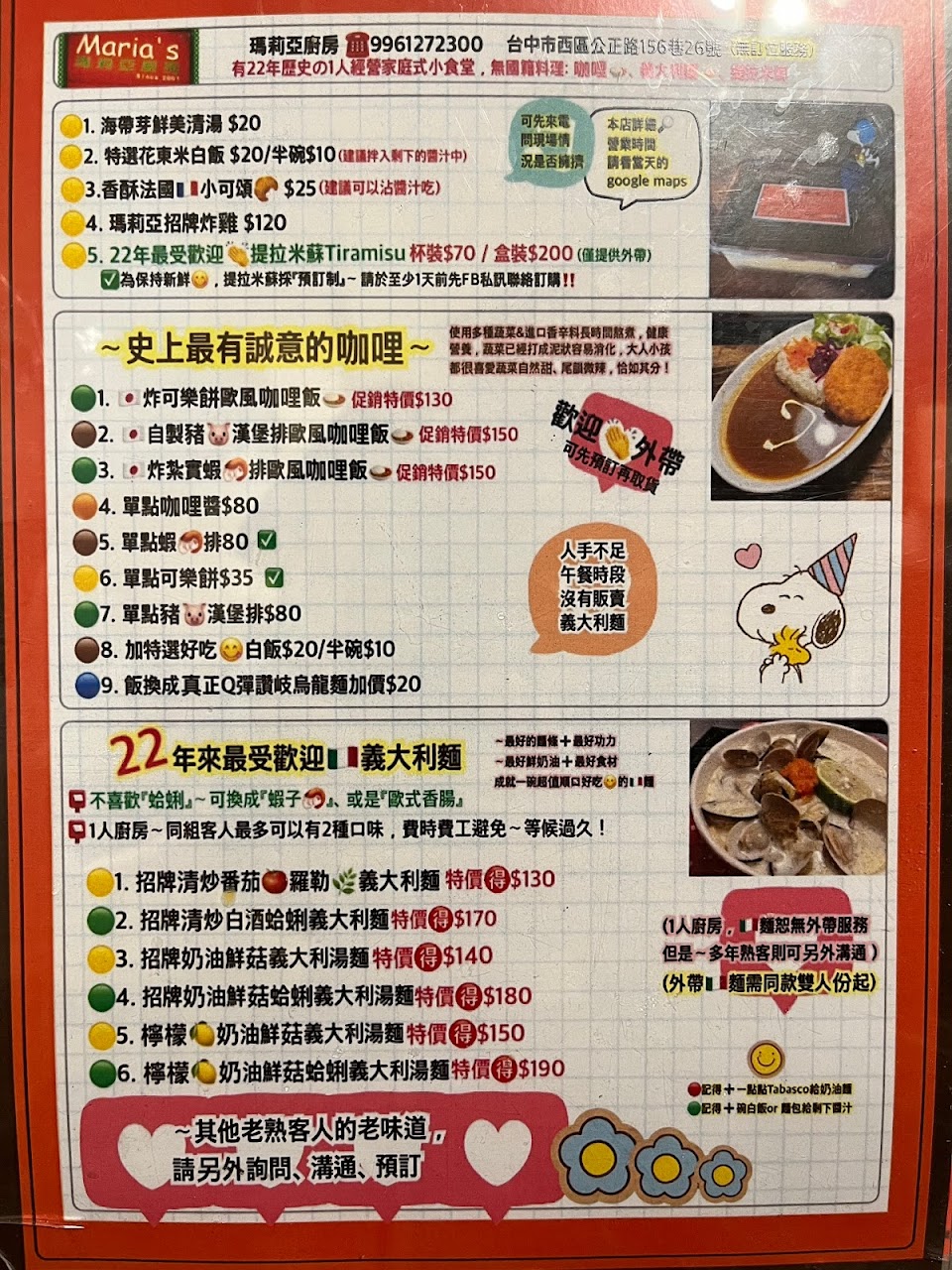 2024最新在地推薦餐廳的菜單_瑪莉亞廚房(家庭式小食堂/歐風咖哩/義大利麵/提拉米蘇)的菜單、圖片
