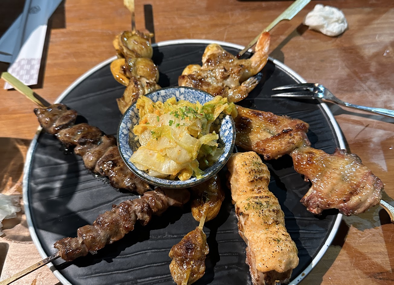 綜合烤肉盤, 炸牛蒡, 日式黑糖麻糬, 揚出豆腐