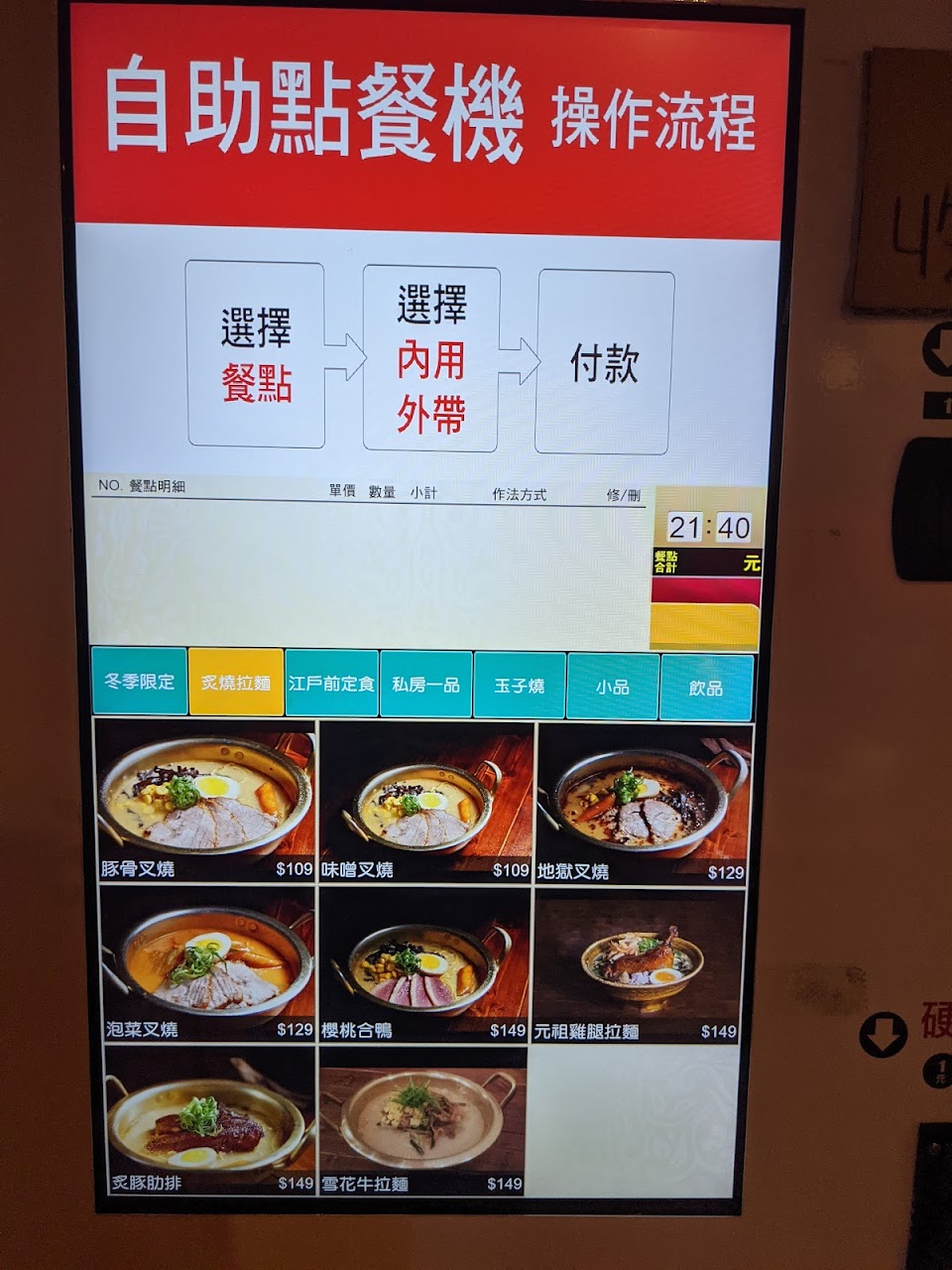 屬於較平價的拉麵店。湯頭不錯,叉燒肉蠻厚的!雞翅好吃!點餐機器很先進。整體而且 性價比蠻高的!