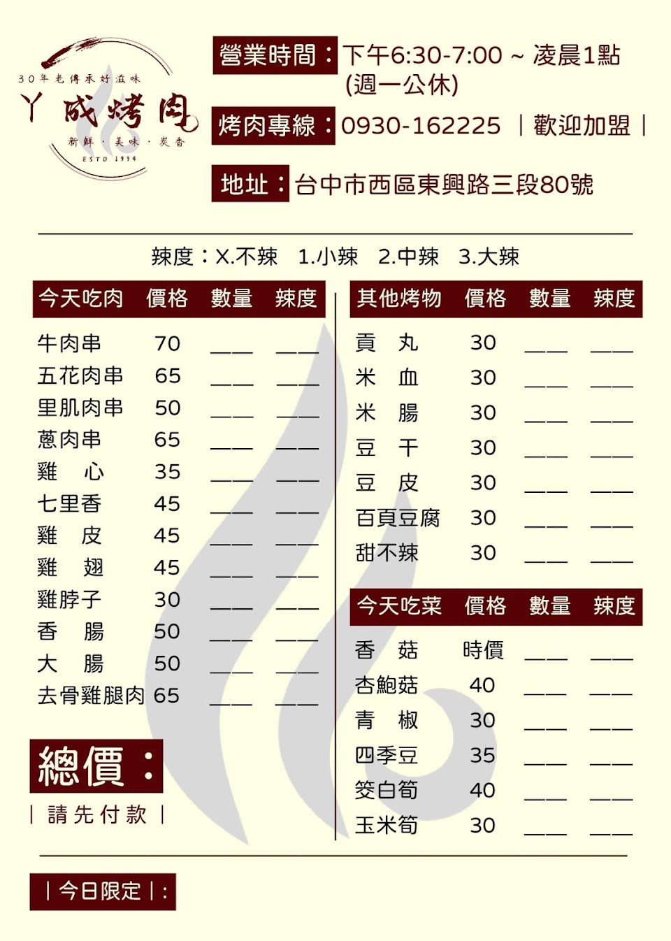 南屯區最好吃的燒烤!老闆很親切,食材新鮮,醬料味道好也烤的恰恰好!超推?建議先打電話預定再去拿,沒有配合外送平台喔!