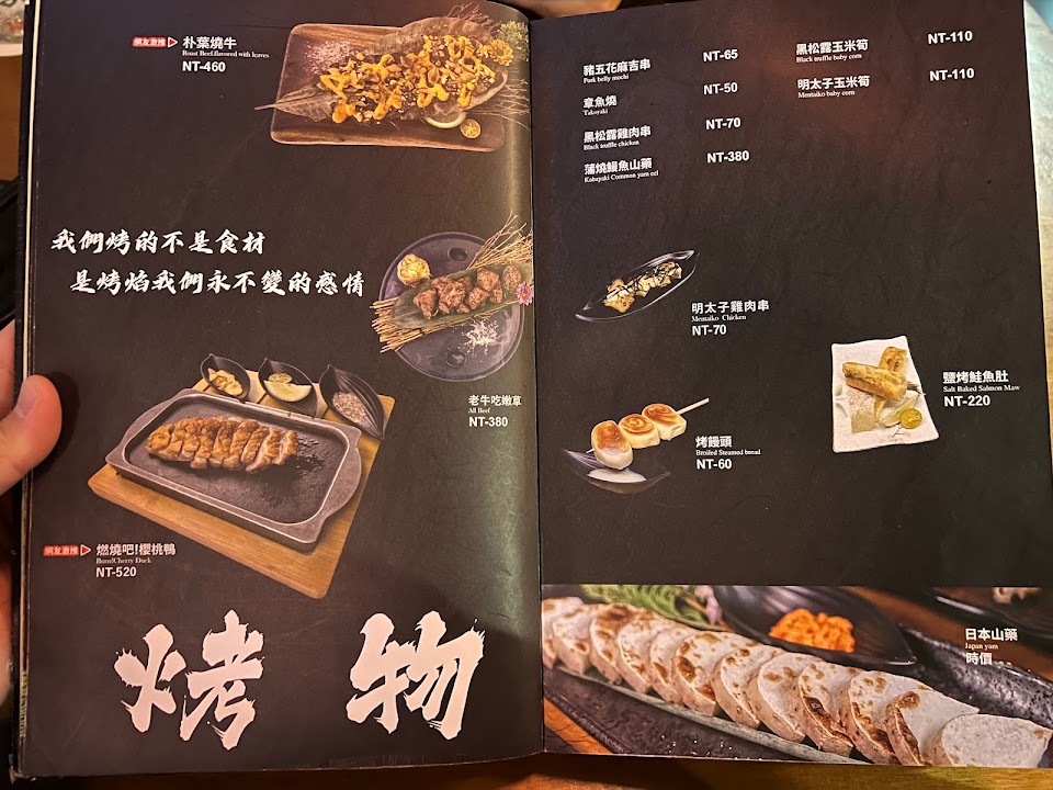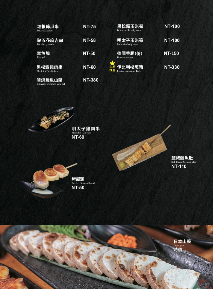 烤香魚, 活跳跳啤酒蝦, 烤骰子牛肉串, 培根節瓜 米血 貢丸, 烤饅頭