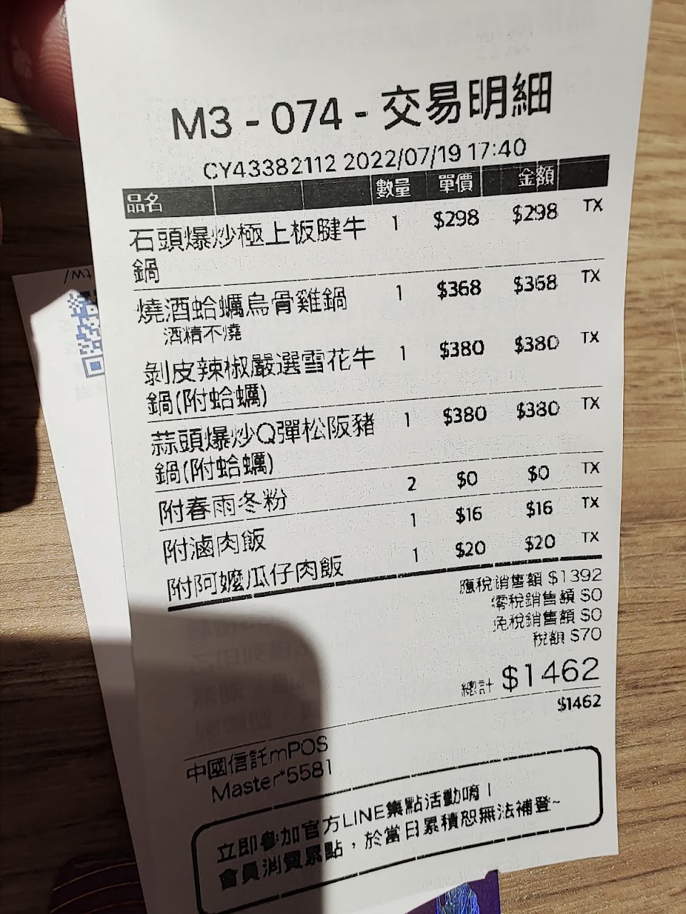 我們4個人用餐,點了3個火鍋,另一位單點滿$200元免共鍋費,點了熟食的香絲鍋巴鹹酥雞跟麻油炸彈都超好吃,下次來要點個白糖粿或其它熟食來試試。