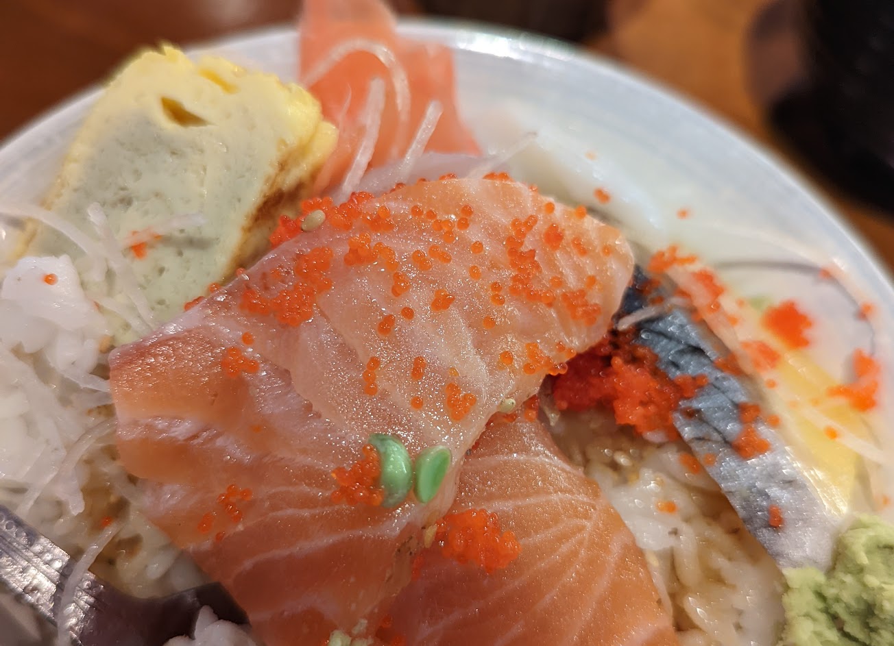 生魚片有點太厚又太長(分次吃才行),魚肉本身未吃到啥鮮甜感⋯醬油太淡, 蒸蛋還好,有放魚肉提升鮮味。