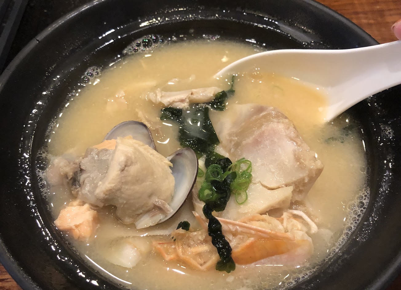 免費附贈的味噌湯,裡面還有蝦頭、魚肉、蛤蜊,好喝?續湯免費 …