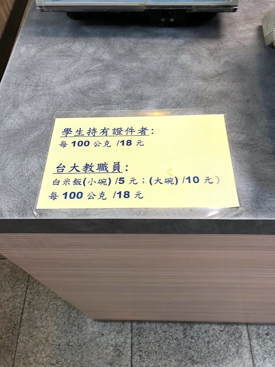 菜色多,自助取菜,計費方式用稱重結算,肉類會加價,一餐約百元左右,續白飯一碗五元,台大學生免費,台大學生用餐有優惠,一般民眾也可以用餐,不錯的 選擇cp高