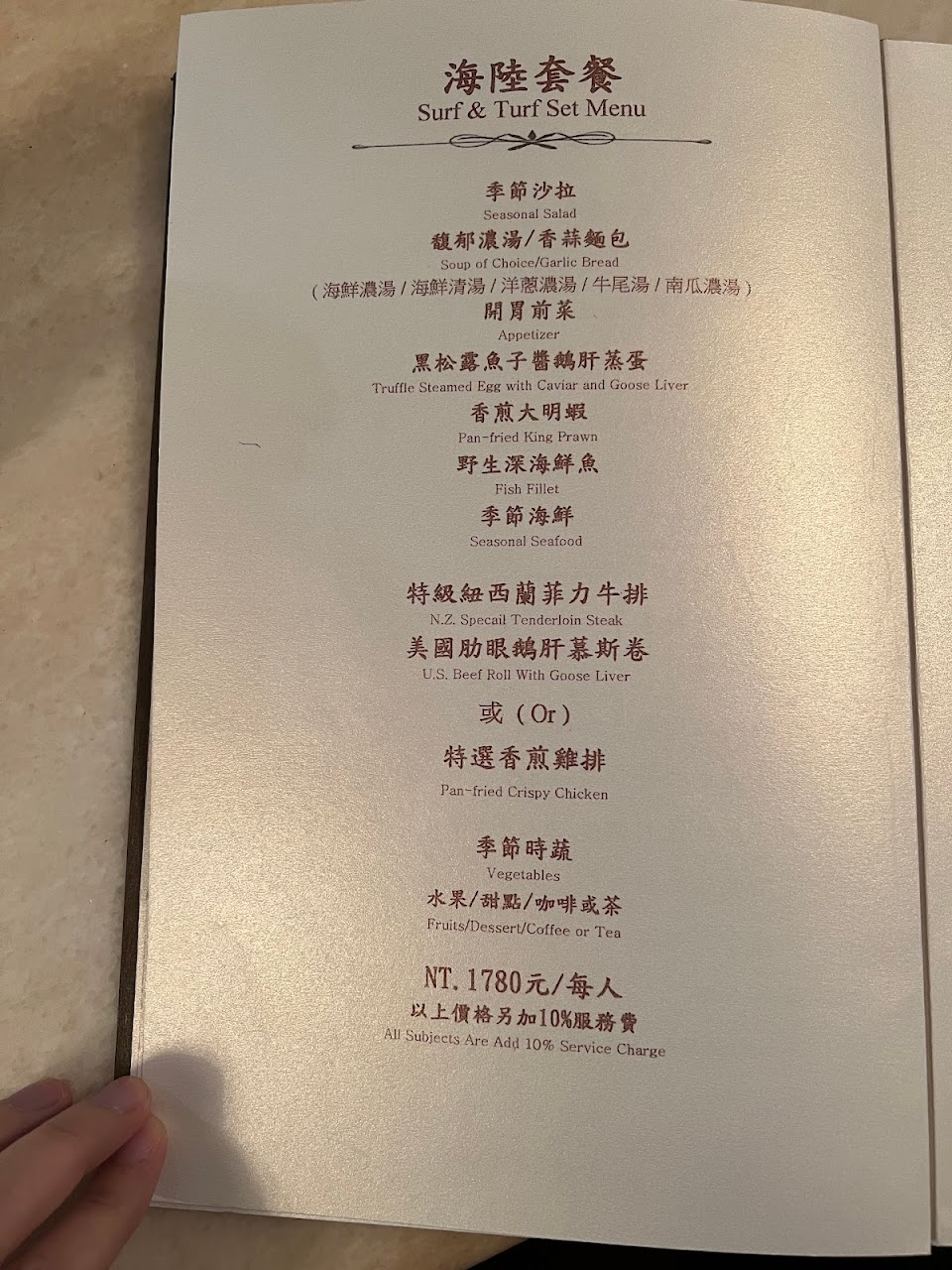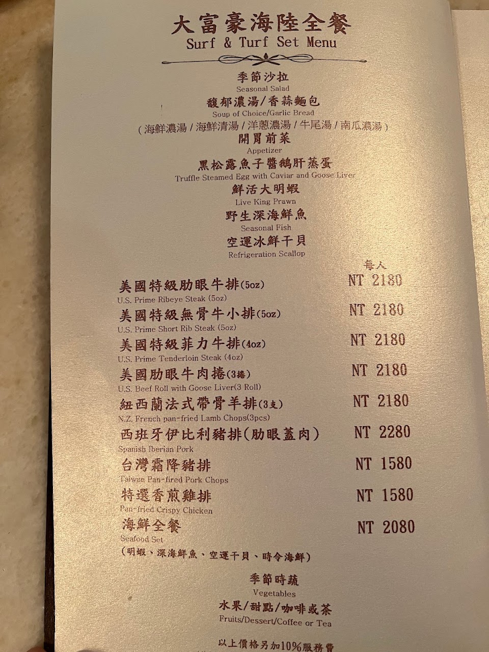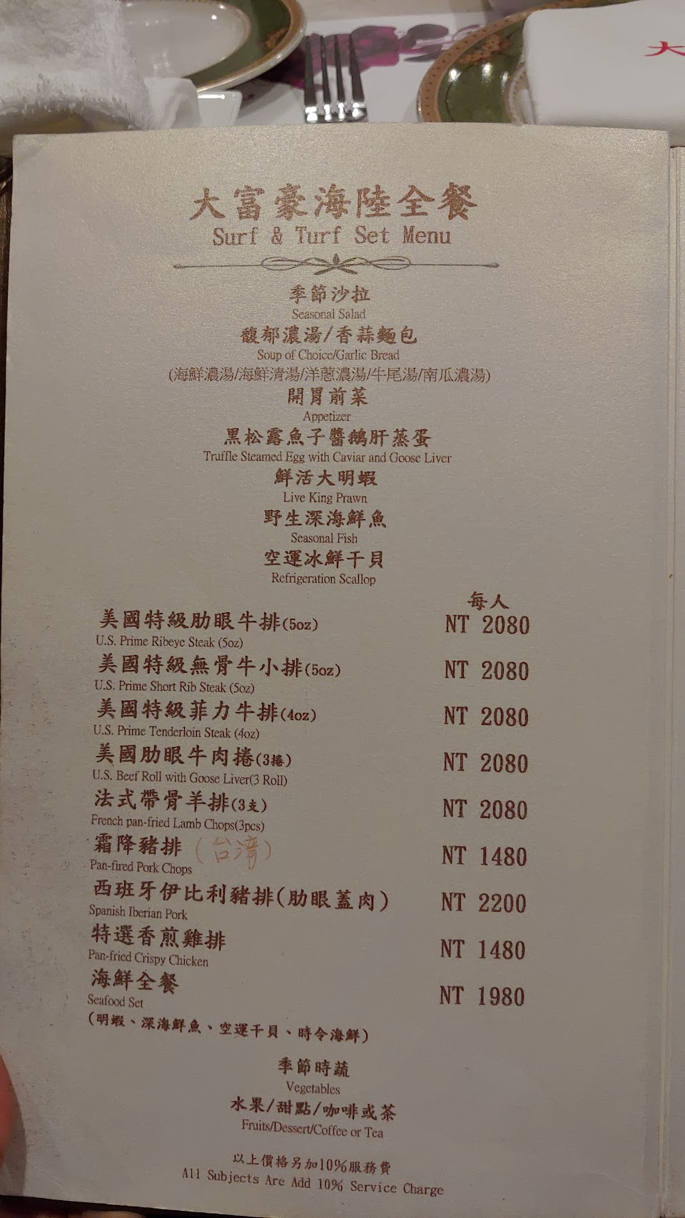 睽違8年後再來一次,一樓挑高的空間跟旋轉樓梯還是很氣派,但不知道是嘴變刁還是口味變了,感覺沒有當年的好吃,這次點了雙人海陸套餐(龍蝦配肋眼)一人3280+10%,雖然吃得飽,但覺得不到這個價位。