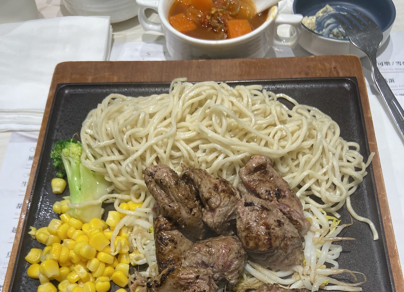 很喜歡細鐵板麵被煎的脆脆的口感,原塊肉吃起來也算多汁,無限續的玉米湯和羅宋湯中規中矩的好喝,自助吧小方塊麵包脆脆的很適合到處加