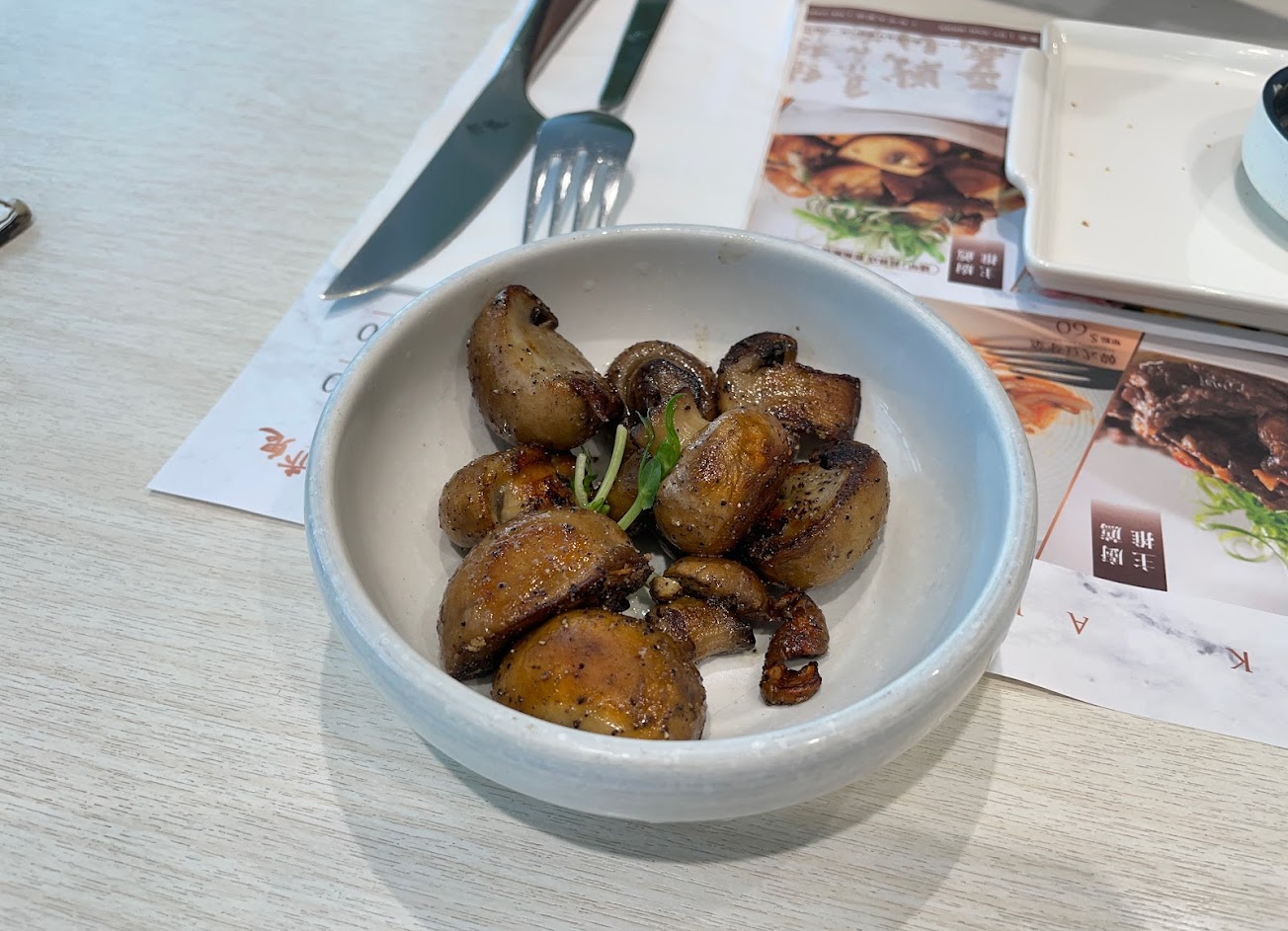 點5分熟但拿到的牛排接近8分,可能是因為鐵板偏燙的關係吧,肉質表現和價格有一定的差距。單點的炒蘑菇好吃,無限自助的濃湯也還不錯。感覺是間親子客很喜歡的餐廳,店裡有滿滿的小孩。
