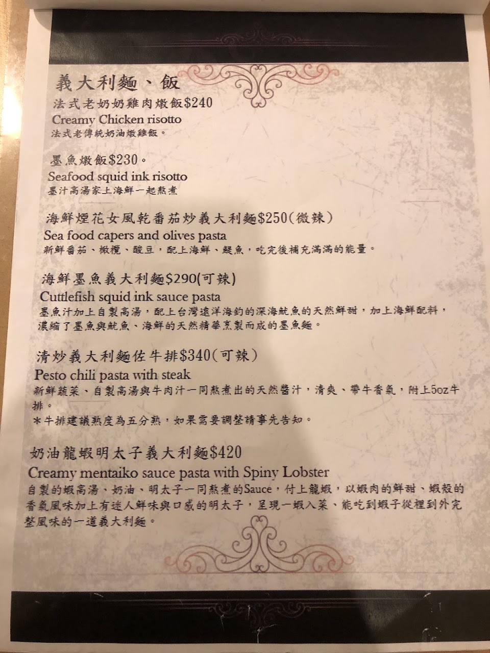 1. 威靈斯牛排$680 2.法式雜菜煲$320 3.奶油龍蝦明太子義大利麵$360 4.美式Juicy豬勒排$420 5.海鮮煙花女風乾番茄炒義大利麵$250 6.海鮮墨魚義大利麵$290 7.比利時淡菜鍋(L)$380 8.奶油松露野菇溫泉蛋(換熟蛋)義大利麵$240