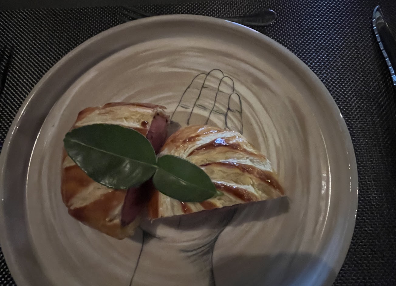 開胃醋飲:果醋+葡萄柚+海葡萄+鮭魚卵 建議一口喝掉,一剛開始入口有果醋的酸,後面吃到海葡萄跟鮭魚卵的時候出現,海鮮的鮮甜味,口感很豐富,但我可能不太懂?。 冷盤(檸檬雪酪、綠葡萄佐牡丹蝦):檸檬雪酪入口微酸,吃到後面有檸檬微苦的韻味出現,整體不甜。綠葡萄泡過蜂蜜,吃起來有蜂蜜甜甜的搭配綠葡萄本身的甜,很好吃,牡丹蝦有炙燒的香氣,吃起來很彈牙,很讚。