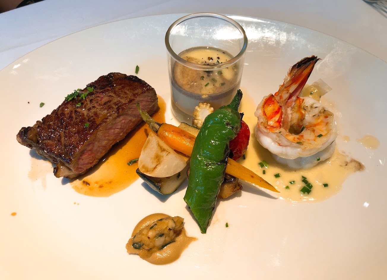 週六晚餐在週五就幸運地預約到了(中餐千萬記得越早訂越好)餐點方面非常滿意,晚間1380套餐我們四個人嘗試了: 麵包(配奶油實在太搭,別吃太快免得後面吃不下) 開胃菜都非常優秀:蘑菇蝦、mozzarella佐番茄、鴨肝沙拉和干貝。 湯品:洋蔥湯有點太濃怕會影響吃主餐的味覺,而雞湯和玉米湯都還不錯。 主餐都很滿意:黑松露小牛肉超嫩!極推!小羔羊相比之下有點失色但旁邊的番茄內包了節瓜和彩椒好好吃,鵝肝和干貝墩飯在水準之上,但私心希望干貝可以換成多一點鵝肝XD。 餐後甜點除了基本的烤布蕾、冰淇淋蘋果派和濃巧克力蛋糕表現水準之上以外,加價點了香橙酒舒芙蕾,不淋醬以前內部就有酒味了不愛酒味的朋友多注意,口感不錯但少了點蛋香。