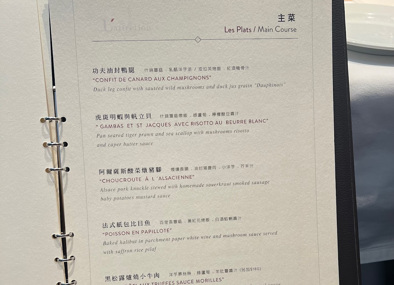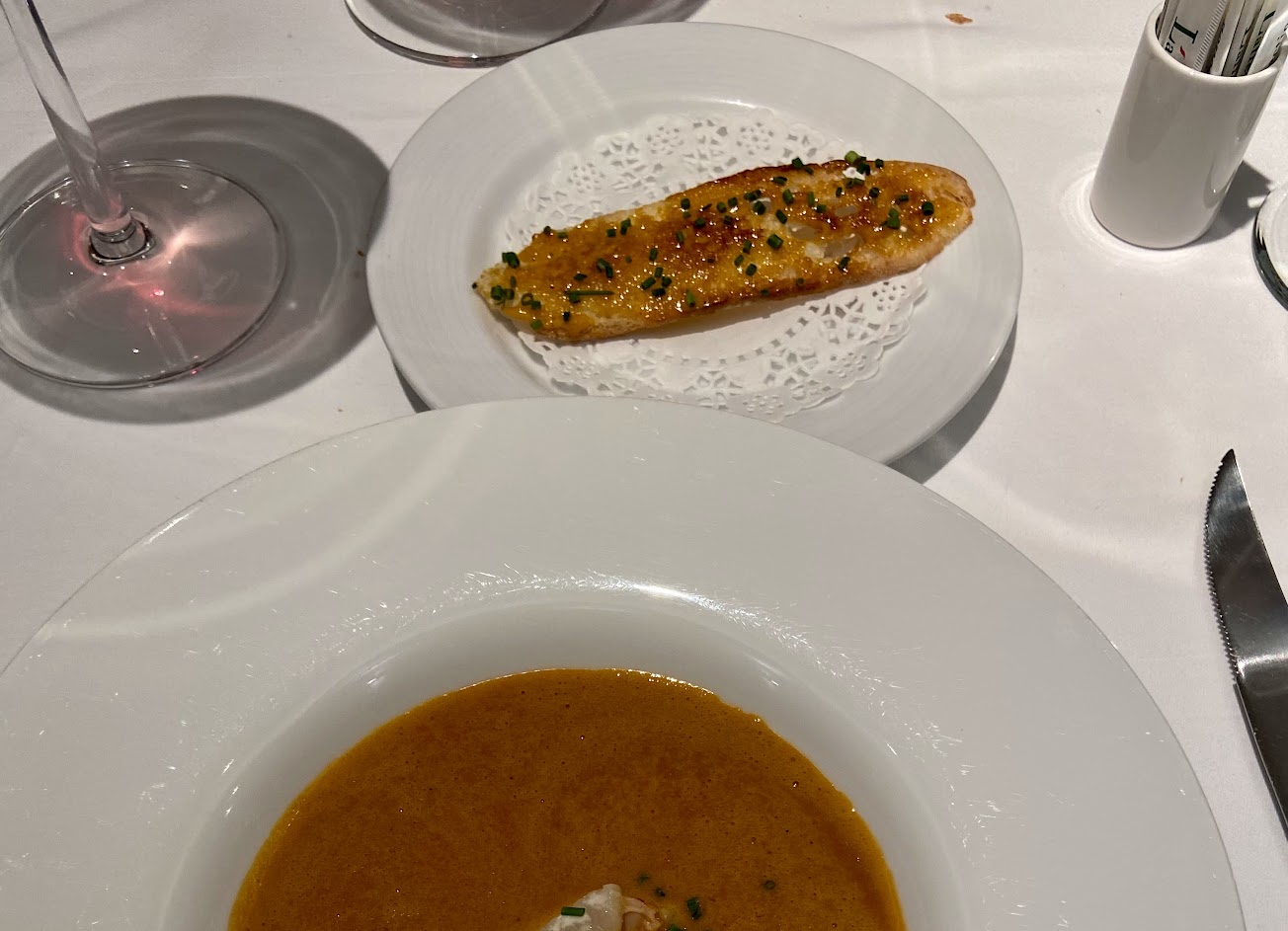 預約11:30的如果當天熱或下雨就別提早到了 因為得在門外等待⌛️真的蠻熱 不然就不要預約11:30 – 麵包沾那個橘色的醬:普通 酒:普通 環境:普通,餐桌很小 水:不錯 一人70$氣泡水 金槍魚:普通 蝸牛?:不錯 麵包:不錯 豬腳:好吃 鴨胸:好吃 玉米蟹肉湯:普通 酥皮濃湯:不喜歡,酥皮戳下去後湯就消失了,超級濃 冰淇淋蘋果甜點:不錯 芒果甜點:普 服務:好 價格:高,兩人4818$ 咖啡☕️:普 餐點:4 服務:5 氣氛:4