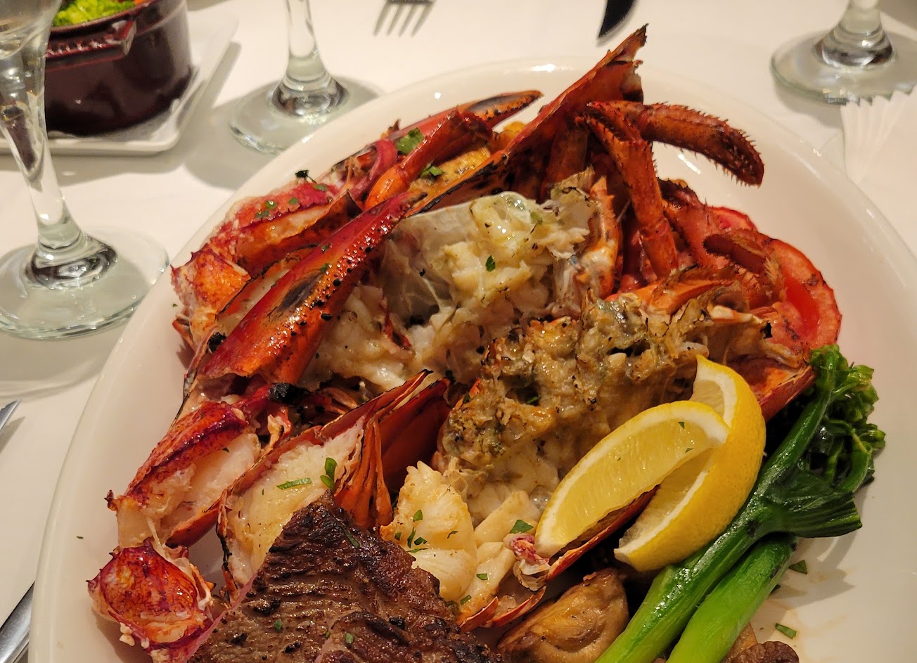服務算是無可挑剔,但是以肉類來說,有點柴(豬跟肋眼),龍蝦麵跟蘋果派很好吃!