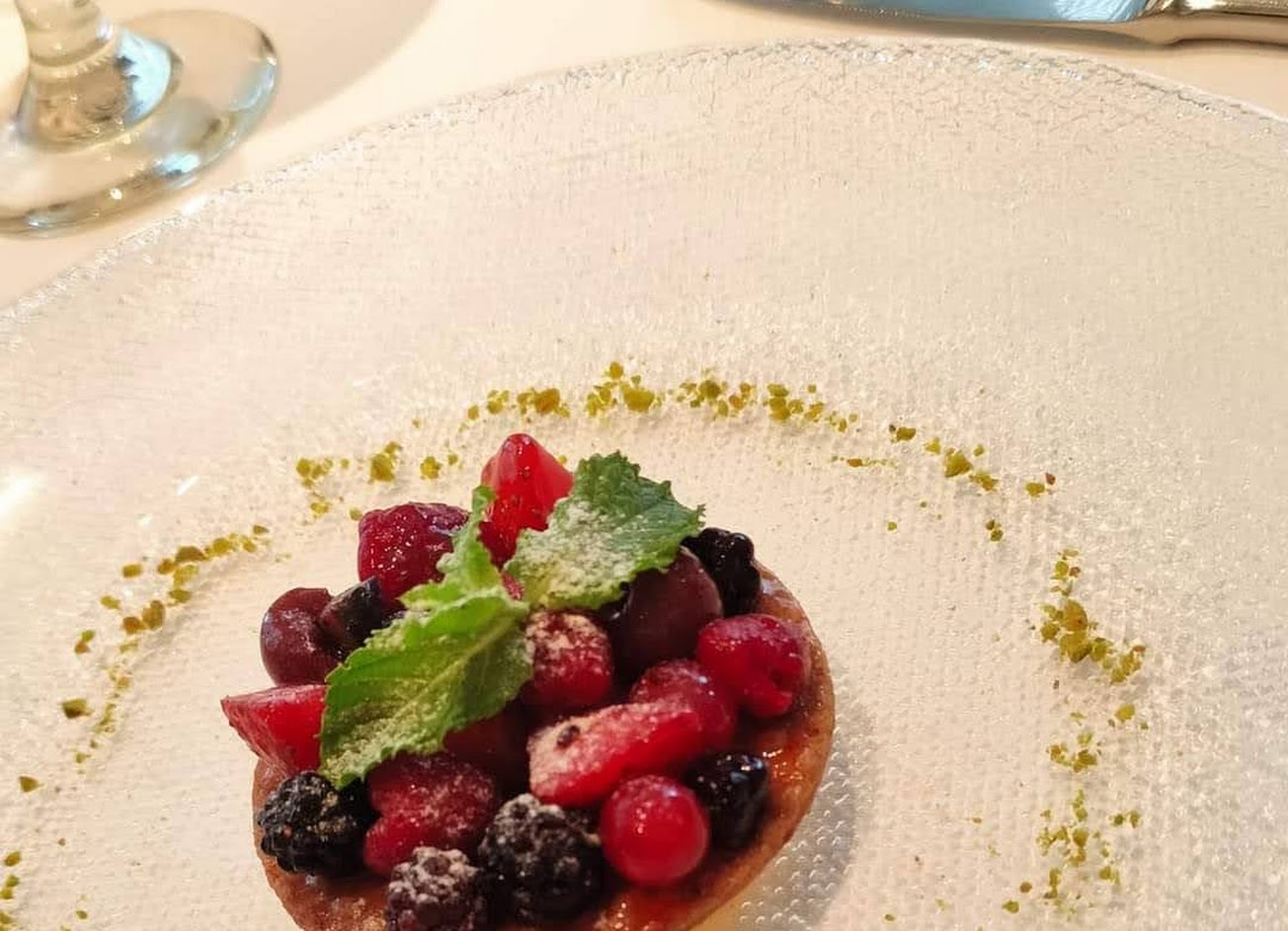 吃的是七夕情人節套餐? 烘蛋吃起來偏鹹 搭配烤酥片吃會好很多 麵包部分很鬆軟很好吃 鴨肝凍的味道個人不太喜歡 不多做評論 濃湯味道很香 中間還有干貝一顆 很鮮甜 龍蝦很香 蠻有彈性的 但有點難咬斷 雪酪部分口感就跟冰淇淋一樣 主餐的話 因為和先生都不吃牛羊 所以有伊比利豬和鴨胸可以選擇~ 我吃的是伊比利豬 固定七分熟 吃起來口感像牛排一樣 配上酸酸甜甜的梅子醬 很有記憶點的一道菜✨ 最後一道甜點 白酒漬水蜜桃意外的很甜 很好吃~