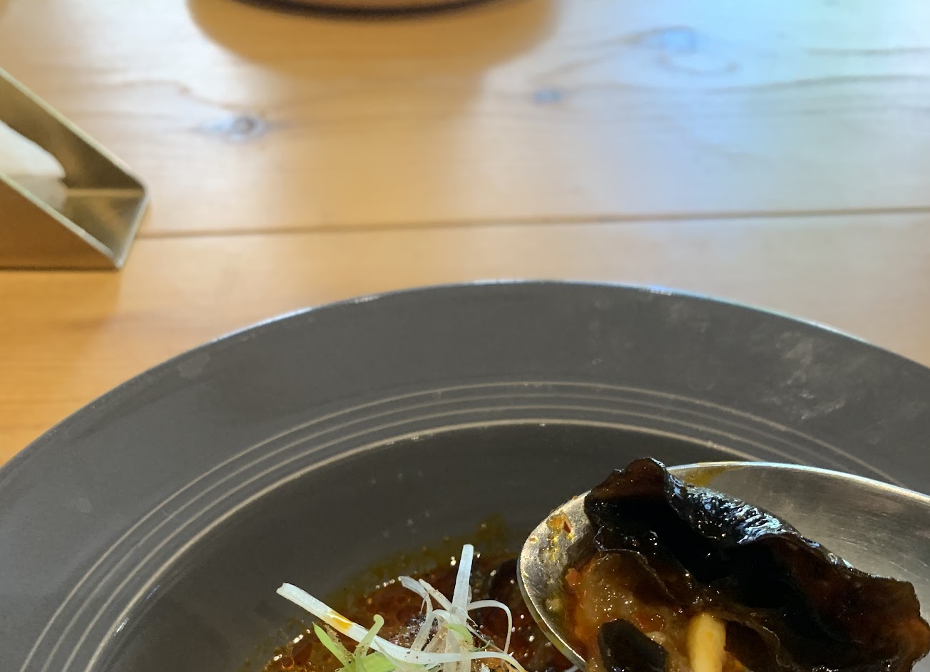 當天是抱著期待但緊張的心情去吃的,沒有看太多介紹只有看圖片,所以一直抓不到到底是吃哪一國的料理,就想說當天去嘗試看看。去之前有先爬評論發現座位擁擠故選擇靠窗位置,用餐時間為晚上,會被外頭的感應式照明燈干擾到,有點可惜。