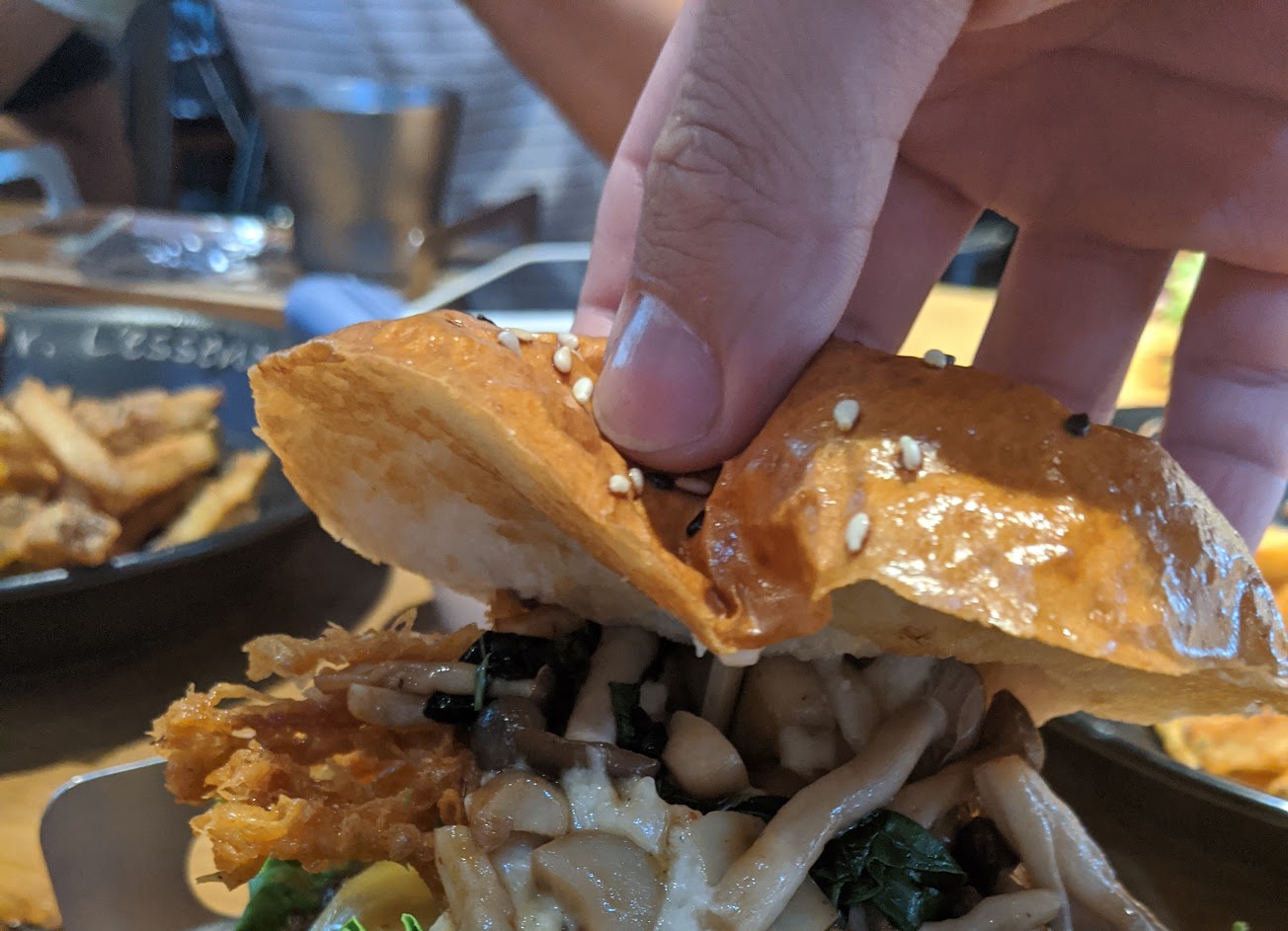 餐點真材實料,好吃,招牌是牛肉排堡,沙朗牛排吃起來肉質普通,但是超多蘑菇的醬料救了整個牛排,如果要再訪的話會點牛肉堡之類的,雞腿排倒是沒什麼問題,也很好吃