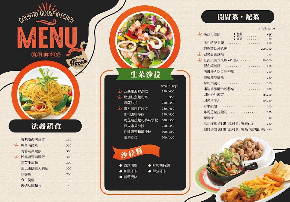 鄉村鵝店內外的裝潢都是一種歐洲家庭風,很像到西方電影的農村人家用餐一樣。用餐當天家人有點飢餓,本來想先電話點餐,但老闆很阿沙力的說他們的菜都上很快。一入座便立刻點了兩道開胃菜,果真不到5分鐘就出菜了。尤其烤餅很好吃,有蕃茄酸味的莎莎醬搭配香濃酸奶,讓人十指大動,炒洋菇也用香草與橄欖油調味得很適中,很想讓人。 義大利麵與燉飯我們都點了新推薦的口味,蟹味奶油義大利麵充滿濃厚的螃蟹以及點綴得恰到好處的蟹肉。味道很濃郁,適合幾個人一起分食,不然會有點膩口。而海鮮燉飯則是中上水準,吃得到新鮮的海產,再加上燉飯的份量也蠻多的,讓人有飽足感。 覺得不論是氣氛或者服務員的接待,都讓人覺得很舒適,是會讓人想要帶親朋好友來聚會的好去處。