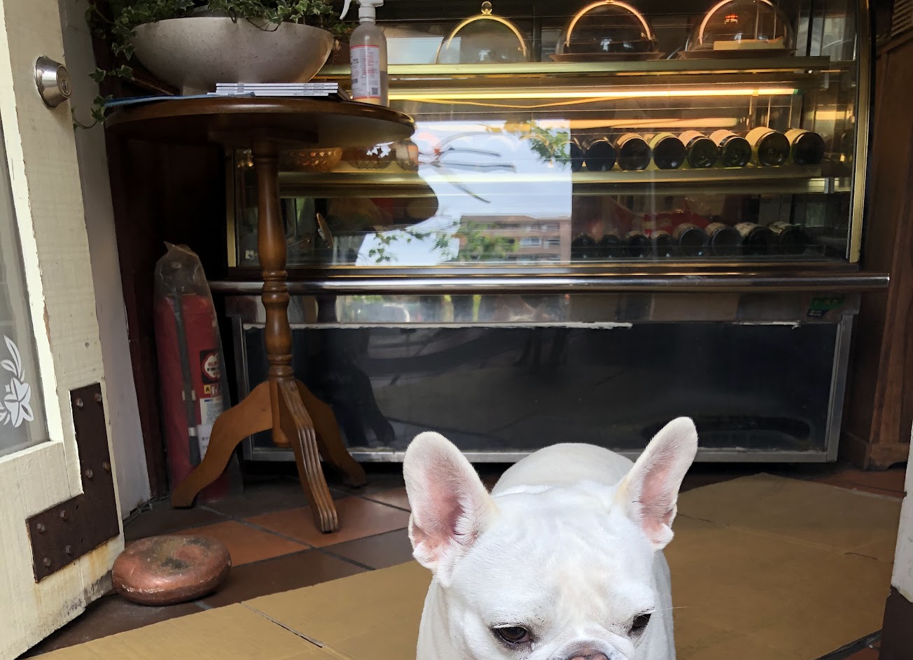 座位在落地窗前,愉快的和朋友聊天,冬天的微風悉悉吹入,暖陽照著店內的狗兒