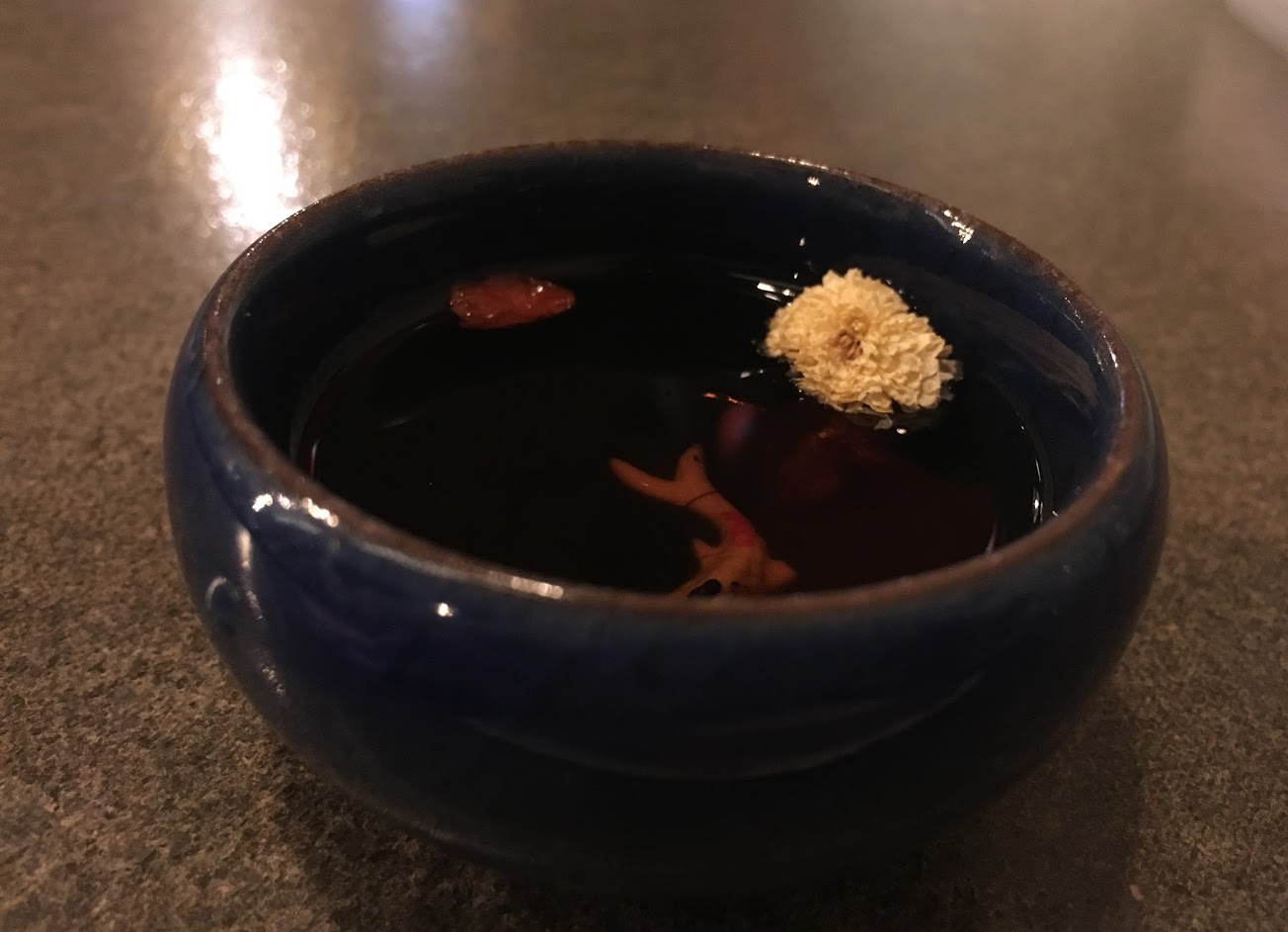 餐點有創意,推薦花卷類和火烤飯,我點的是叫化子火烤飯,用紙包著飯去烤呀!口感像義式燉飯,味道很入味,口味偏重。 非常獨愛餐前的枸杞菊花紅茶,不僅好喝且杯底有鯉魚在游呀游~