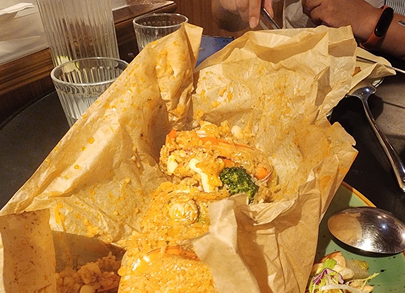 今天下午1:30到店用餐 有一點小小心得 1、店內應該是接單後才製作,但這樣導致我們這桌等了將近一小時才用到餐 2、我點了唐揚雞凱撒沙拉,生菜新鮮清爽,但醬汁再多一點會更棒 3、南洋咖喱火燒紙包牛肉,醬汁希望再多一點,咖喱醬味道欠缺濃郁感受 整個紙包飯弄起來像癱掉的南部粽,鹹度不夠,但牛肉處理的好 3、另一位家人點了小火鍋,豆腐太扎實,吃起來有點像海綿⋯⋯有些菜沒有煮熟 4、說真的餐點不算便宜,所以會對它有更高的期待,希望日後能再進步,我覺得本質上是好吃的料理,再修正一下下會更棒。 服務 內用 餐點類型 午餐 平均每人消費金額 $400-600 餐點:3 服務:4 氣氛:5 建議的餐點 紙包飯, 松阪豬花捲