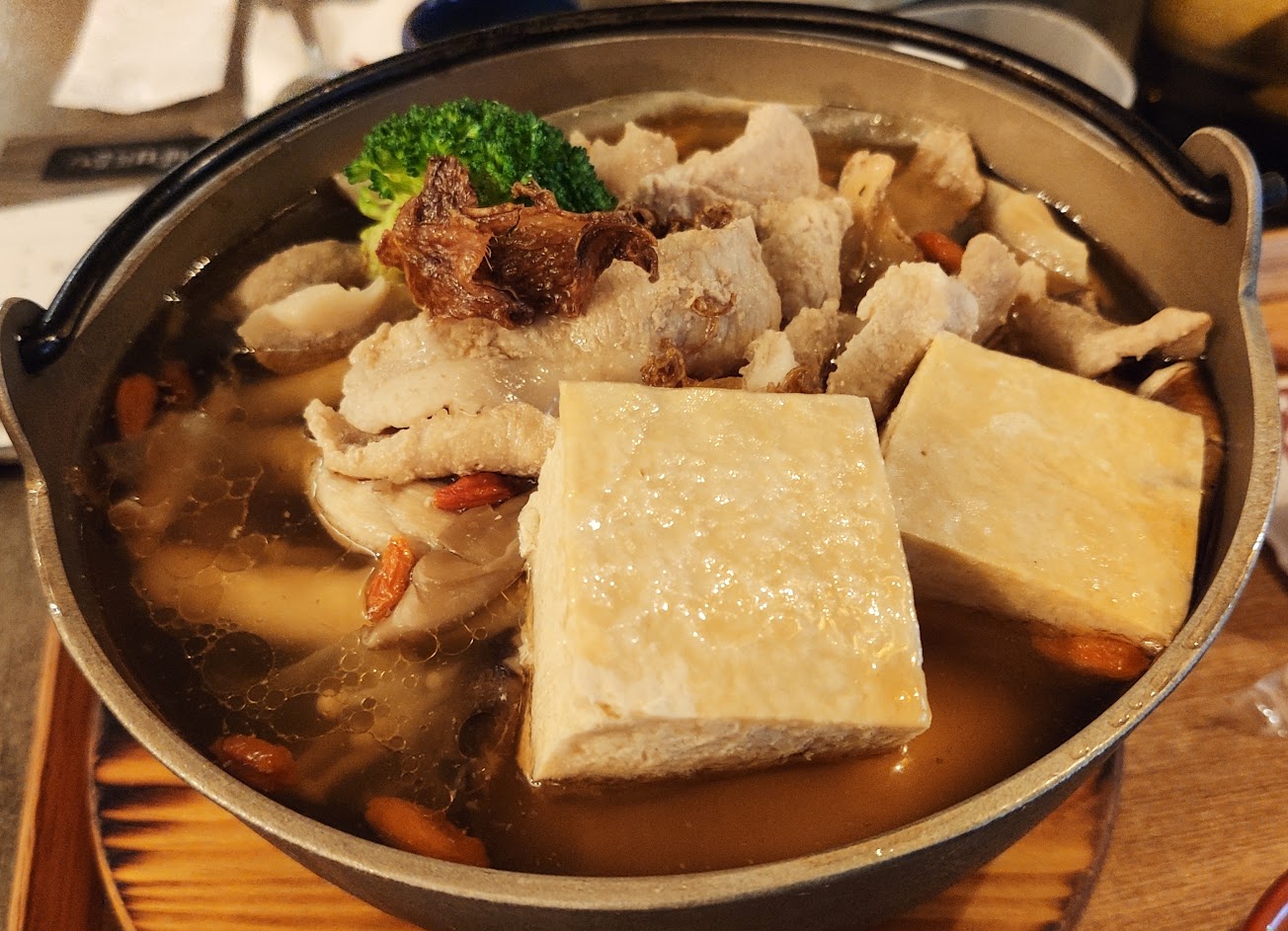 個人覺得餐點份量很多,餐廳氣氛很好(空間大、音樂不會很吵),唯獨洗手間沒那麼整潔 餐點部分 叫化子雞火烤飯加起司:雞肉很嫩而且飯量跟雞肉都很多 麻油雞燒鍋子:吃了老半天才吃掉大概四分之一?這鍋唯一我不太喜歡的就是松阪豬,對我來說有點太硬,但一般人吃應該都沒問題。高麗菜、菇類、凍豆腐都好吃,湯也很好喝。 另外有請一小杯枸杞紅茶,超好喝!下次去加99升級套餐喝這個紅茶?(而且小杯子裡面還有金魚超可愛的)