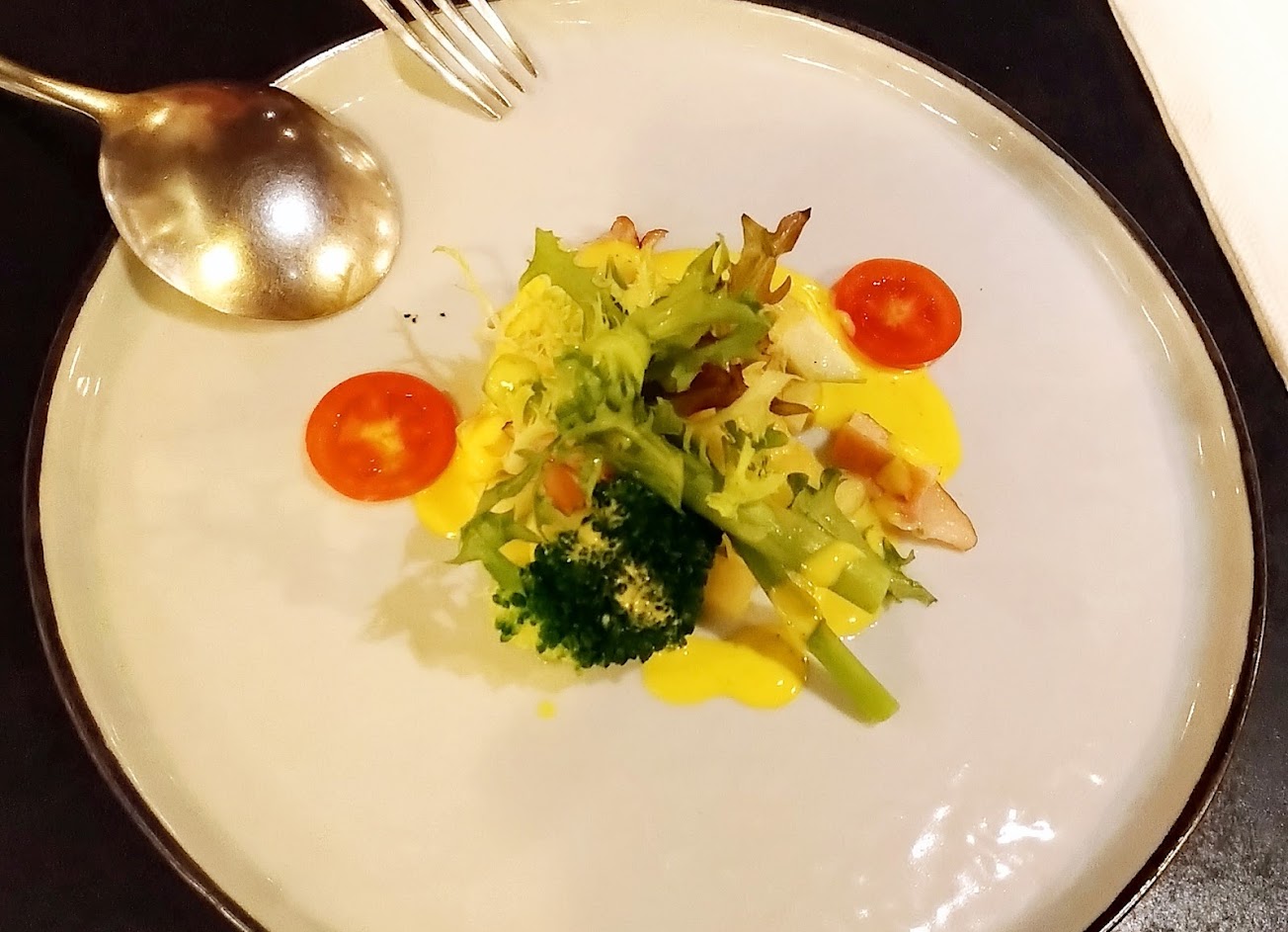用了很多台菜元素點綴 很驚艷 1. 前菜用滷蛋將蛋黃取出做成蛋黃醬 蛋白滷的類似日式角煮的甜 搭配上甜蝦跟魚卵很驚艷 2.凱撒沙拉醬料不油膩 唐揚雞非常嫩吃到後面冷掉依然不軟濕 起司增加更多的香味,很棒 3.叫話子雞烤飯相當驚艷,用了很特別的米,即使米粒軟爛依然吃得到米心,胡椒為底加上照燒醬真的很香,雞肉高溫烘烤後相當多汁軟嫩很優秀,蔬菜也不少也都處理的恰到好處 4.烤飯的配菜是蒸蛋搭配XO醬與地瓜片,非常特別的組合,蛋體溫度控制的相當好蛋不會過硬,地瓜片帶出了蒸蛋的甜,XO醬帶出了蛋的鮮甜 5.每一步都充滿巧思且都有到位,非常優秀的餐廳會再回訪