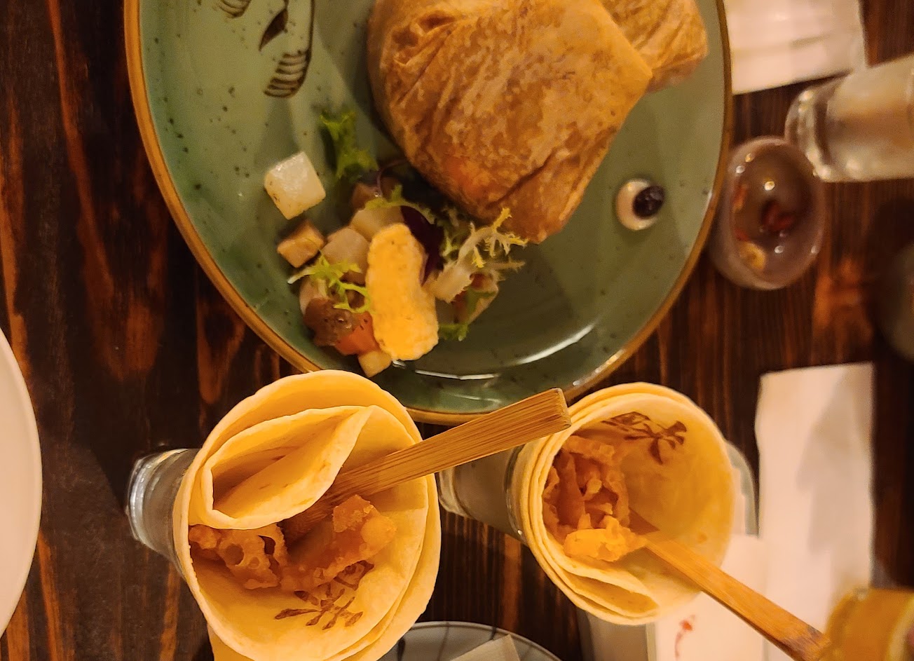 有幾項素食餐點,(我點野菇聚花卷)怕吃太多甜椒的人慎選?我個人是不挑食,覺得口味還不錯,且餅皮和料是分開的,所以可以自己隨意卷,很特別,愛怎麼吃都可以!餐點覺得小小可惜,明明是‘’野菇‘’聚花卷,但甜椒的數量卻比菇多⋯希望可以再平衡一點!