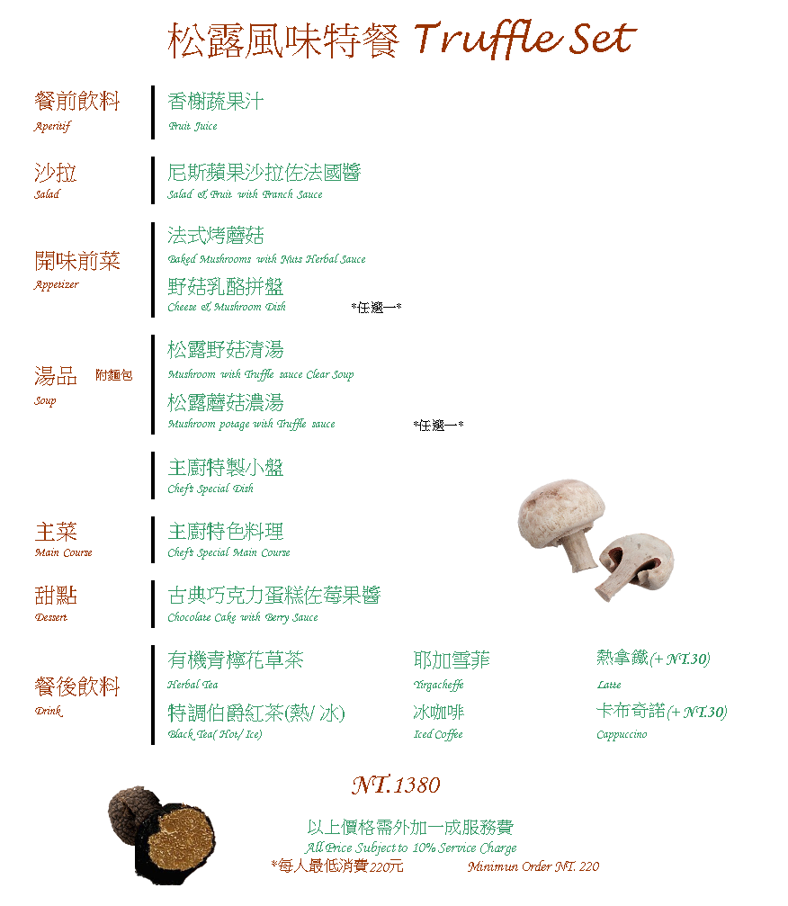 松露野米飯很香,茶樹菇好吃但湯的味道普通,沙拉油醋醬清爽不膩,茶飲附的小點人家有介紹,但是忘記了是什麼,所以沒試。