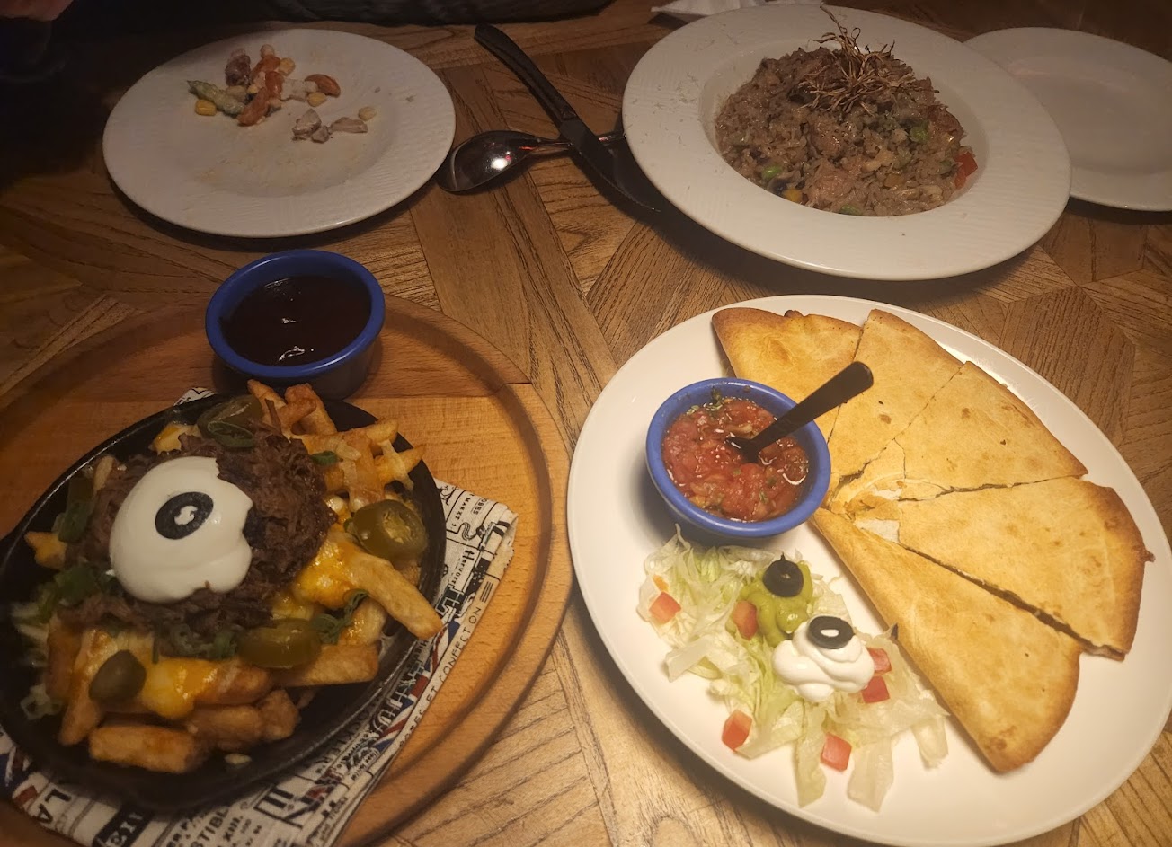 無法被簡單分類為墨西哥餐廳或美式餐廳,因為他甚至還賣泰式與中式餐點。 店內空間大,佈置十分有趣,充滿復古海報與裝飾。點餐上菜速度都不錯,服務人員貼心但不過度殷勤,是讓人十分舒適的態度。 與家人同行是個不錯的選擇,每道餐點看起來都不多,但實際分吃完大家都有吃飽。瑪格麗特披薩的味道是純粹的食材香,個人來說很喜歡。 廁所有小小的有趣設計,有興趣的人可以找找看(但請不要侵犯他人隱私)。吃飽喝足還能到對面美術館園區散步,感受夜晚的雕塑有多恐怖。 今日唯一的不足之處在於附近不是那麼好停車,隔壁雖然就有停車場,但晚餐時段全滿,必須停到較遠的地方。或許在非假日時段會有更好的體驗,但不是今天。