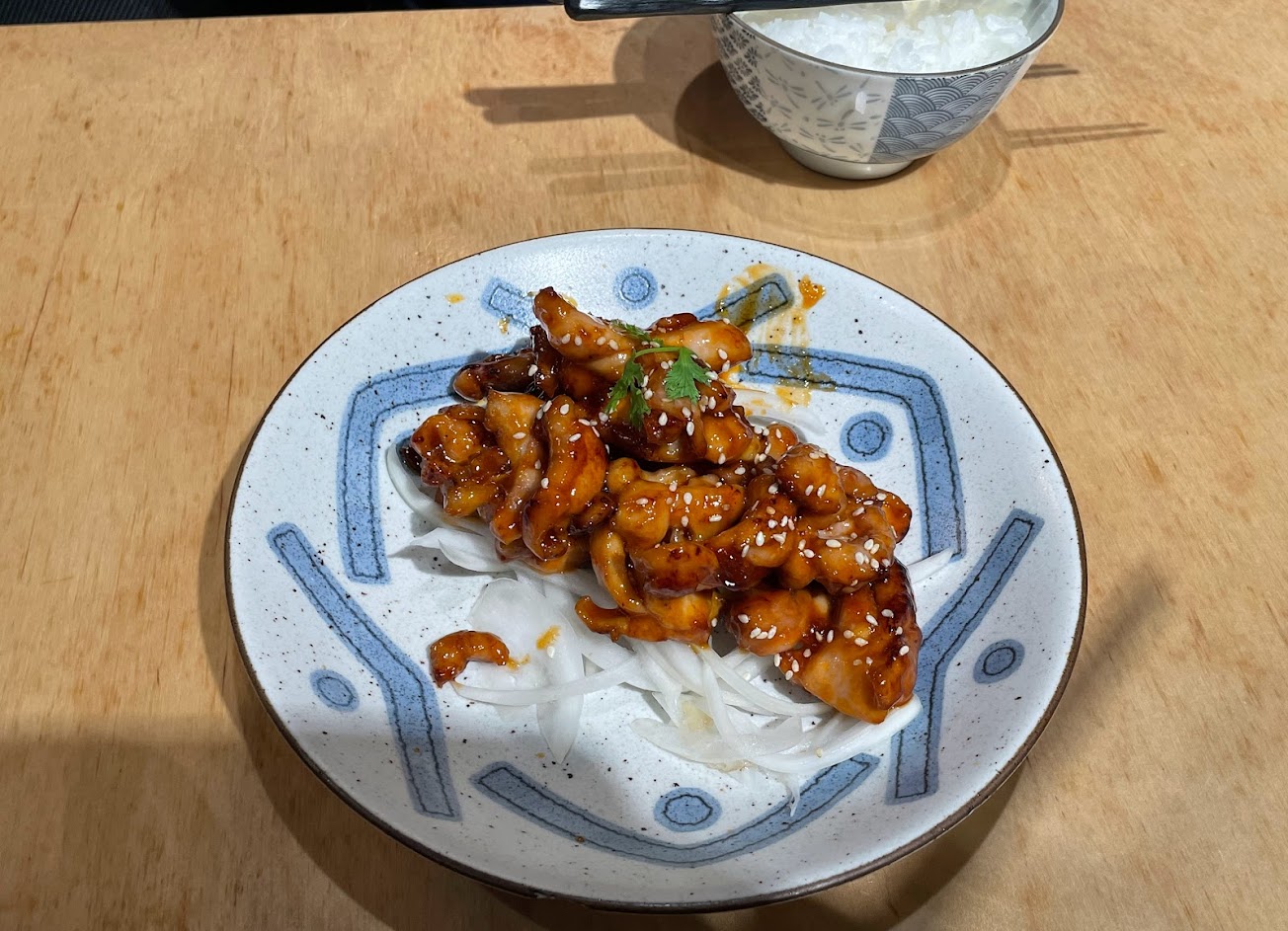 酸甜酸甜的口味,梅子的酸蠻突出的,雞肉本身很嫩,也被醬汁包覆的很均勻,搭配鋪在下面的洋蔥,比較不會膩。