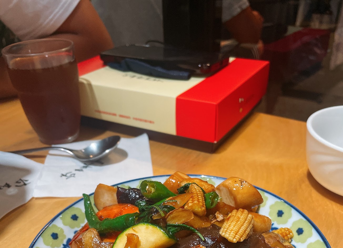 因為有點鍋巴蝦仁?紅咖哩椰汁?肉醬所以怕吃不了太多請服務人員不要提供白飯,吃飽後抬頭看到⋯好像是用 很厲害?的米⋯(///▽///) 可惜錯過了,另外還有提供免費?湯或冬瓜茶 其他還有⋯金沙美人腿炒牛肉、酸辣醬醉仙透抽、蝦醬高麗菜,都超好吃?透抽炒的嫩的不的了,口味清爽不油膩,總之非常可以來試看看哦!