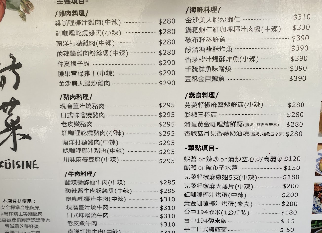 每人低消為一份套餐(主餐、台中194馥米、湯/飲品擇一),今天兩人點了兩個主餐,店員建議我們可以點一份青菜,這樣吃下來覺得份量很好❤️ $350牛菲力月見香蘋奶油燒 先品嚐牛肉原味,再配蒜片、蘋果奶油醬品嚐,最後再戳破溫泉蛋與醬汁結合,肉質鮮甜軟嫩,是層次豐富的一道菜,不愧為店內招牌。 $295綠咖哩椰汁豬肉 和之前吃過的綠咖哩比起來感覺椰漿比例較多,菜單上寫中辣,原本還擔心太辣,但椰漿讓辣度更柔和,小辣人覺得剛剛好!醬汁不會很鹹,白飯被偷完又不想加點白飯的話直接喝湯汁也可以? $150酸筍炒水蓮 今天最讓我驚艷的一道菜,滿滿一座水蓮小山,新鮮、爽脆,配上酸筍讓人一口接一口,超!好!吃!真的很好吃! 店內用餐限時一小時,出餐速度ok,我們從店內坐定到吃飽結帳是39分鐘,這次是一個月前線上預訂,後續訂位系統不會再主動傳訊息提醒,所以一定要好好記住哦? 服務 內用 餐點類型 午餐 平均每人消費金額 $200-400 建議的餐點 酸筍水蓮