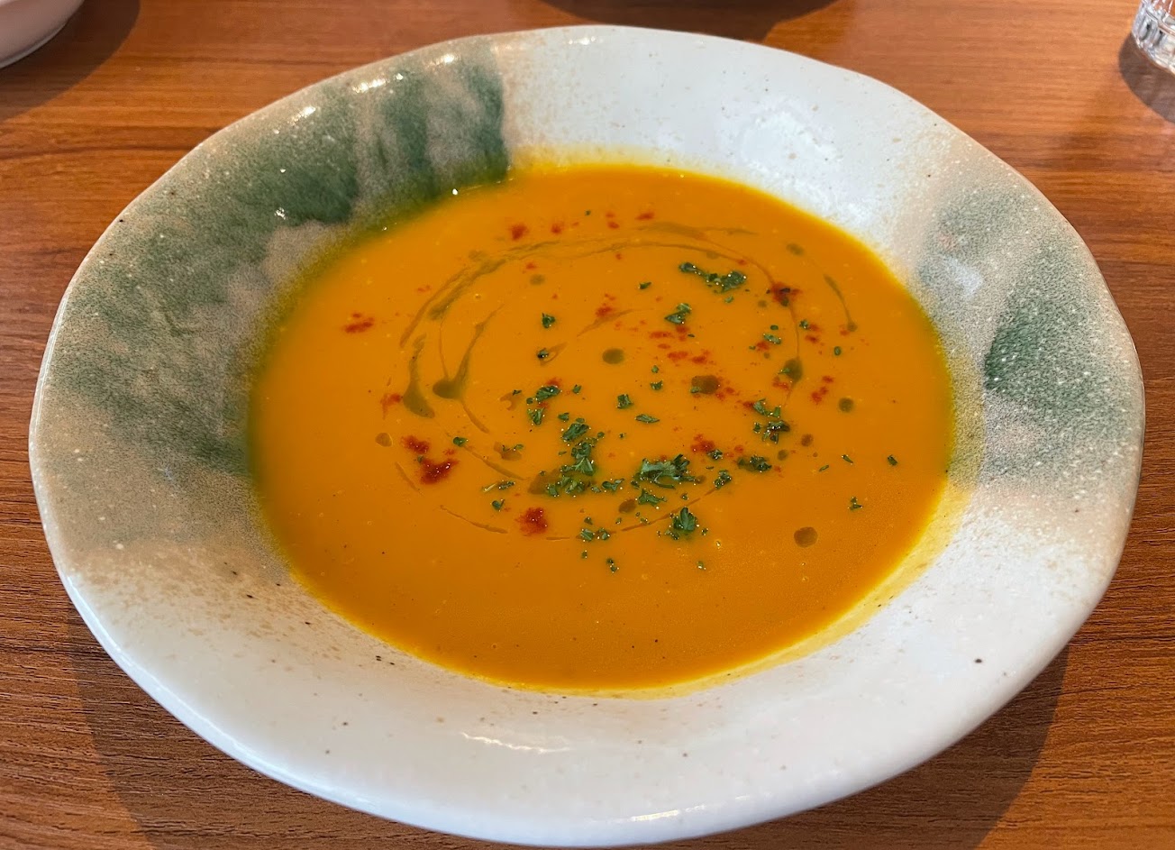 點兩份主餐皆升級套餐 最先上的南瓜湯蠻濃郁的,有香料提味 一起上餐的麵包可沾濃湯或油醋,各有風味 沙拉也蠻清爽的,小番茄有醃漬過
