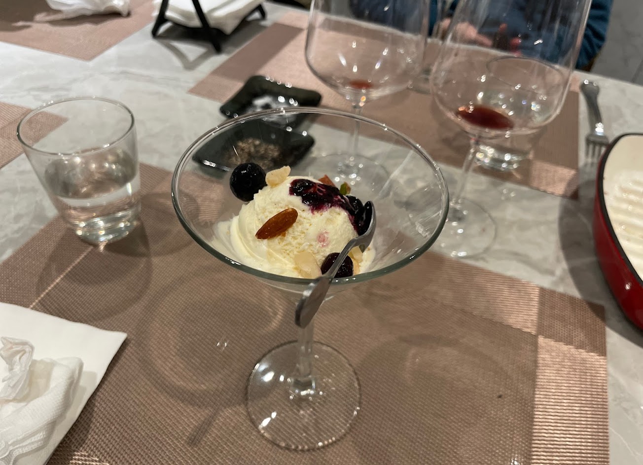 菌菇濃湯甘美、海鮮前菜美味、依比利黑豬肉口感獨特令人難忘、甜點有層次不會過於甜膩,再配上老闆挑的好酒,充分感受到美食饗宴的幸福滋味。