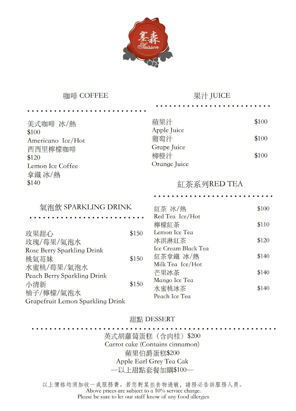 2024最新在地推薦餐廳的菜單_Saisson Cuisine Restaurant 塞森餐廳(週一店休,但可接10人以上預訂)的菜單、圖片